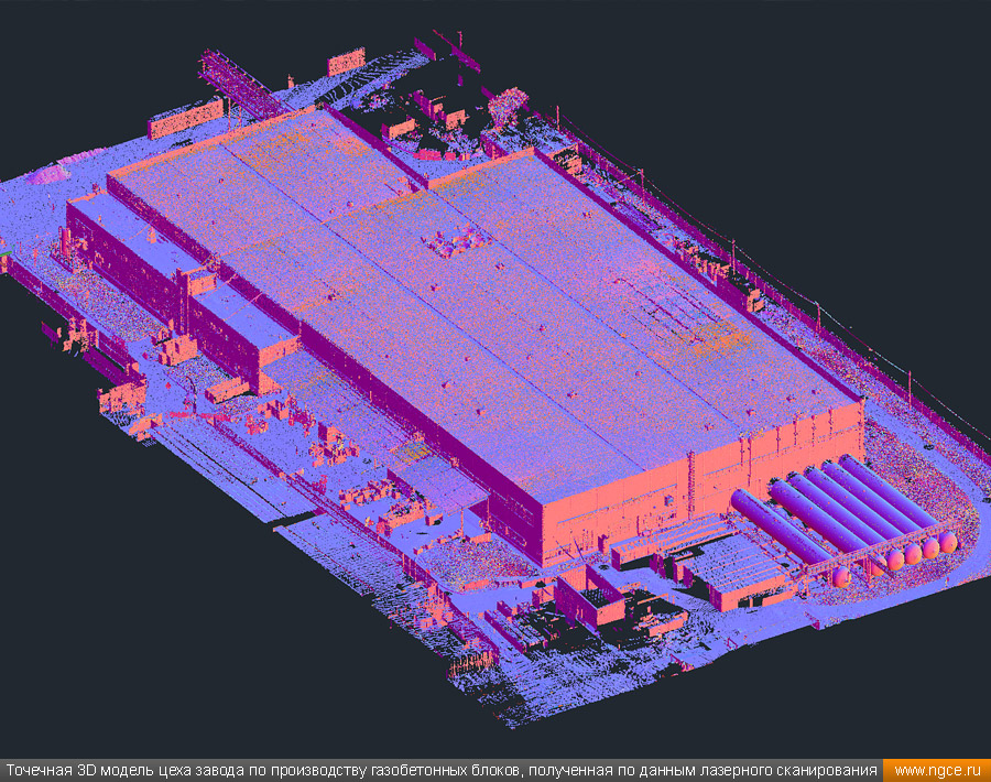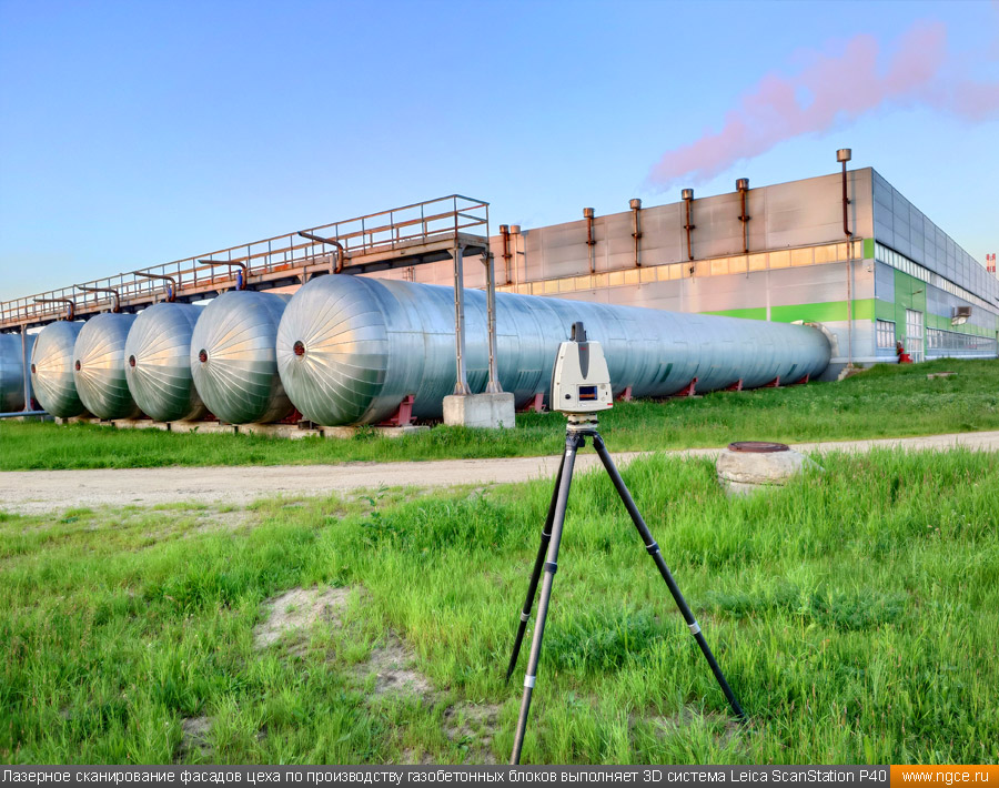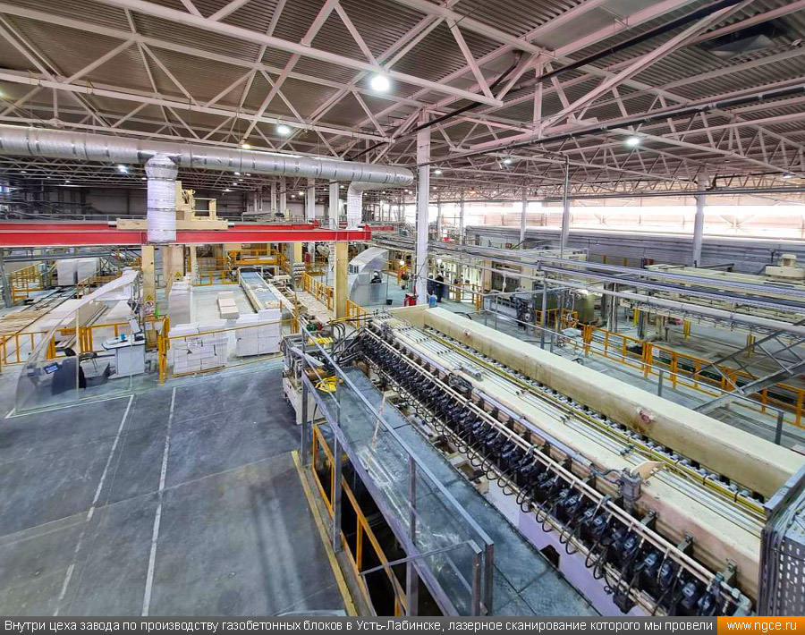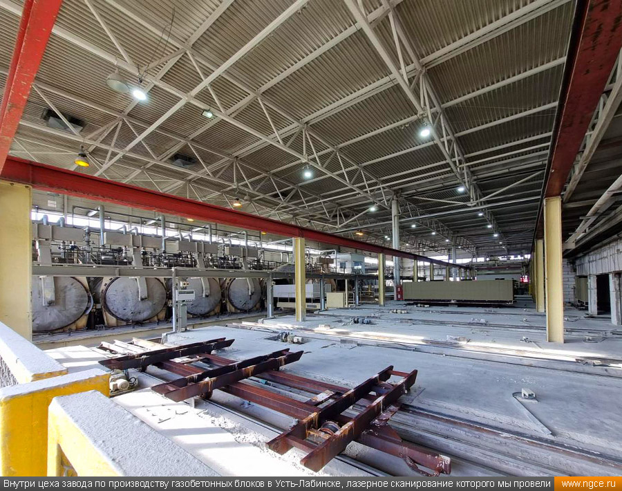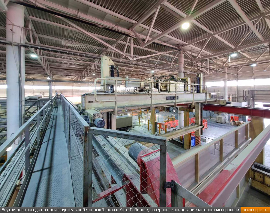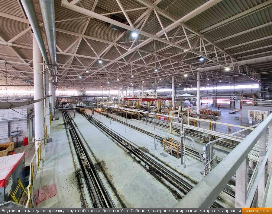 ![]() Инженерное предприятие «НГКИ» в сжатые сроки выполнило проект по обмерным работам крупного цеха на заводе по производству газобетонных блоков в городе Усть-Лабинск в Краснодарском крае для целей актуализации проектной документации и подготовки проекта реконструкции и расширения производства. Точные 3D обмеры цеха завода методом лазерного сканирования для реконструкцииК нам обратились представители проектной организации, которой была поручена разработка проекта реконструкции, модернизации и расширения большого цеха завода по производству газобетонных блоков в городе Усть-Лабинск в Краснодарском крае, с просьбой произвести 3D обмеры цеха и предоставить их специалистам точную обмерную модель объекта. 3D обмеры цеха площадью около 12000 квадратных метров были осуществлены нашими инженерами по технологии лазерного сканирования с помощью системы Leica ScanStation P40. Сканирующая 3D система Leica ScanStation P40 — это высокопроизводительный и высокоточный прибор с большой скоростью лазерного сканирования, которая составляет 1 миллион измерений в секунду. Данный 3D сканер идеально подходит для производства сверхподробных съёмок различных объектов сложной формы, в том числе находящихся на большом удалении. Система способна обеспечивать сведение к минимуму влияние шума на сигнал 3D сканера даже при проведении измерений на максимально возможной дальности. У 3D лазерного сканера Leica ScanStation P40 есть свои существенные преимущества, которые крайне востребованы: так, этот прибор имеет очень большую дальность измерений (до 270 метров) практически без потери точности, а также возможность ручного выбора и лазерного сканирования отдельных областей в режиме повышенной плотности, что особенно полезно при обмерах участков цеха с большим скоплением различного технологического оборудования. За шесть рабочих дней нашими специалистами были отсканированы фасады и кровля производственного цеха завода, а также всё внутреннее пространство, включая склады сырья и административные помещения. Работы по лазерному сканированию осуществлялись без остановки производства и осложнялись передвижением техники, запылённостью, а также высокими температурами в отдельных участках цеха. Несмотря на все сложности, лазерный сканер Leica ScanStation P40, работающий в большом диапазоне температур от -20°C до +50°C и имеющий показатель пылевлагозащиты IP54, отлично справился с задачей. Высокая дальность работы сканера позволила успешно и с высокой плотностью отсканировать участки цеха, на которых производилась отгрузка материалов с площадок, находящихся на верхних уровнях. Всего на полевом этапе выполнения работ по данному проекту нашими специалистами было сделано 445 сканов. Подготовка обмерной точечной 3D модели по данным лазерного сканированияУравнивание и сшивка полученных сканов в единую точечную 3D модель, осуществлённые уже на камеральном этапе работ, заняли четыре рабочих дня. Также на камеральной стадии работ нами была произведена очистка облаков точек от шумов и посторонних объектов. В результате всех выполненных работ нашими специалистами было получено сшитое плотное облако точек (точечная 3D модель) цеха завода по производству газобетонных блоков в формате Autodesk ReCAP (RCP) с возможностью просмотра панорам с каждой станции лазерного сканирования. Инженерная компания 