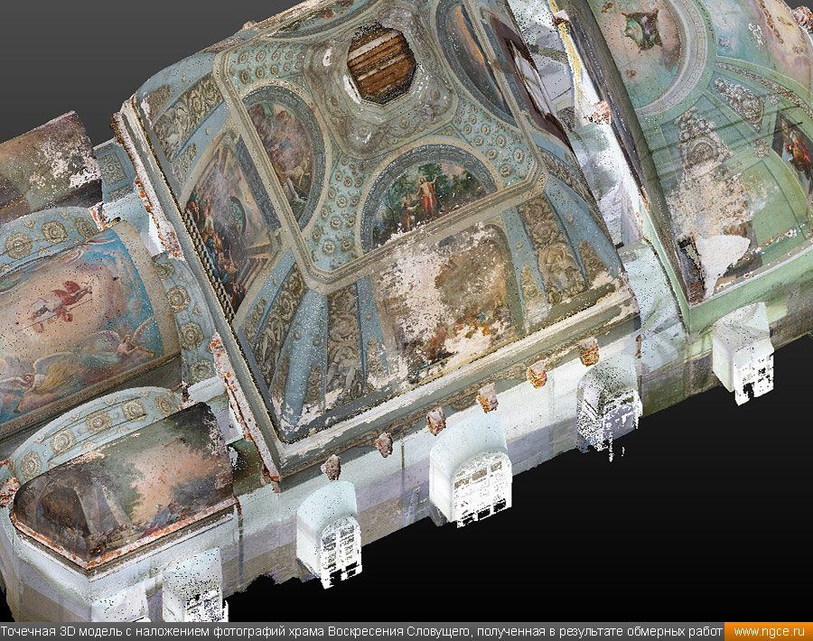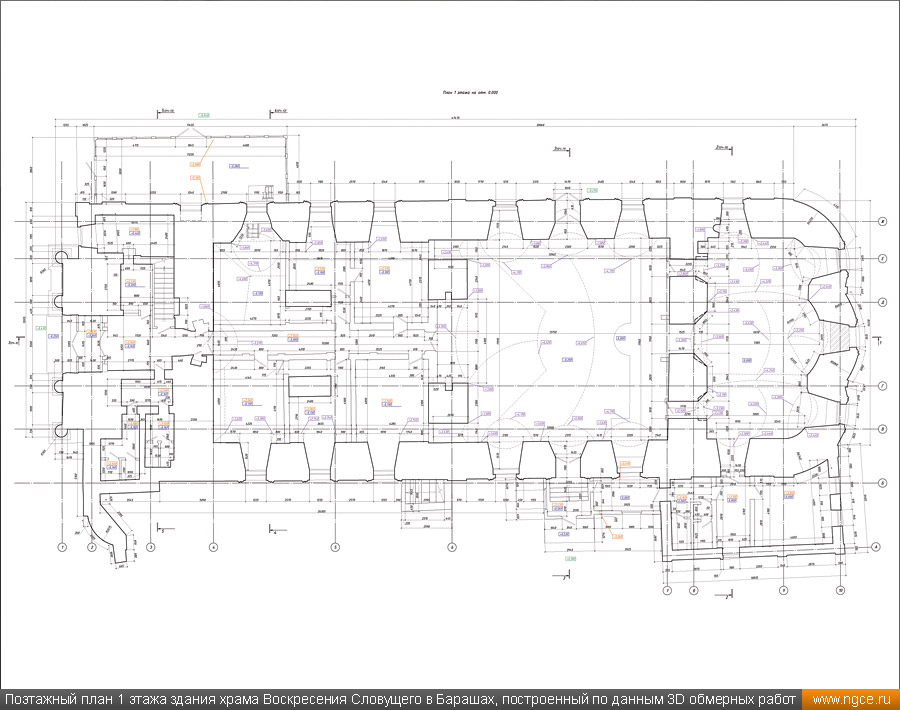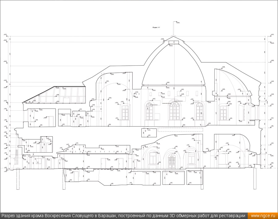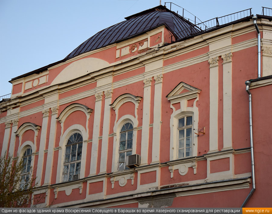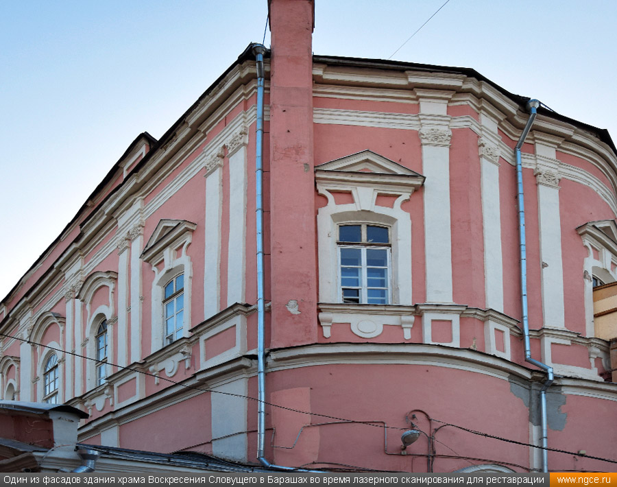 ![]() Специалисты инженерной компании «НГКИ» выполнили весьма интересный проект по 3D обмерам храма Воскресения Словущего в Барашах, который находится в центре Москвы на улице Покровка и является одной из самых необычных церковных построек в современной столице. Обмерные работы на этом объекте были произведены методом лазерного сканирования для целей подготовки проекта реставрации этого храма. Краткая историческая справка о храме Воскресения Словущего в БарашахСогласно знаменитому словарю В.И. Даля, бараши — это люди, служба которых заключалась в том, чтобы в походах разбивать шатры и палатки для царя и царской свиты. Именно на востоке Земляного города, неподалёку от Покровских ворот в XVI–XVII веках и располагалась их слобода. На месте современного храма ранее находилась деревянная церковь Воскресения в Барашах, которая упоминается в Переписной книге начиная с 1620 года, однако в 1652 году деревянная церковь сгорела. В 1732 году решили построить новую церковь, двухэтажную, с тёплым зимним храмом внизу и неотапливаемым летним во втором ярусе. Строительство каменной церкви было начато в 1733 году, продолжалось сорок лет и завершилось в 1773 году. Также параллельно возведению каменного храма в 1745—1746 годах была разобрана старая и построена новая колокольня. В 1773 году был закончен второй этаж храма, куда был перенесён Престол Воскресения. В 1769 году внизу был устроен главный престол Покрова, в связи с разборкой башни Покровских ворот: бывший там образ Покрова Божией Матери перенесли в нижний храм, где центральный Симеоновский престол стал Покровским, а в трапезной устроили новый придел — Симеона и Анны. В 1837 году верхний храм был обновлён на средства Анны Федоровны Мазуриной, тогда же в верхнем храме Севастиановский и Елизаветинский приделы переосвятили в честь святого преподобного Алексия человека Божия и святого Николая. Сама церковь выстроена «кораблём», планы подклета нижнего и верхнего храма совпадают, что является очень редким и интересным явлением в церковной архитектуре. В целом же в результате всех переделок, изменений и достроек всё здание получило яркий и необычный облик в стиле Аннинского барокко. В 1929 году храм был закрыт, началась разборка и перестройка здания. В 1930 году была сломана колокольня, с купола храма сброшена большая золочёная корона из дерева, которая долгое время так и валялась возле церкви. На месте колокольни была возведена бесстильная пристройка высотой в два с половиной этажа. Также была сломана половина ограды, а внутри храма всё переделано. Всю роспись забили и убрали под новые перекрытия и потолки. Храм приобрёл облик почти гражданского строения. Тем не менее, судьба всё же пощадила храм, являвшийся памятником архитектуры XVIII века, и несмотря ни на что, пострадал он не настолько сильно, как это могло бы произойти. С начала 1930-х до начала 1950-х годов здание храма занимала администрация московских лагерей ГУЛАГа — Управление исправительно-трудовых лагерей и колоний Московской области, а с 1960-х по 1990-е годы здесь размещались Управление пожарной охраны Москвы и пенсионный отдел ГУВД. 27 января 2016 года здание храма Воскресения Словущего в Барашах было передано Русской православной церкви, вскоре возобновившей богослужения. Полностью действие храма восстановлено в 2017 году. С 2025 года данный храм находился 