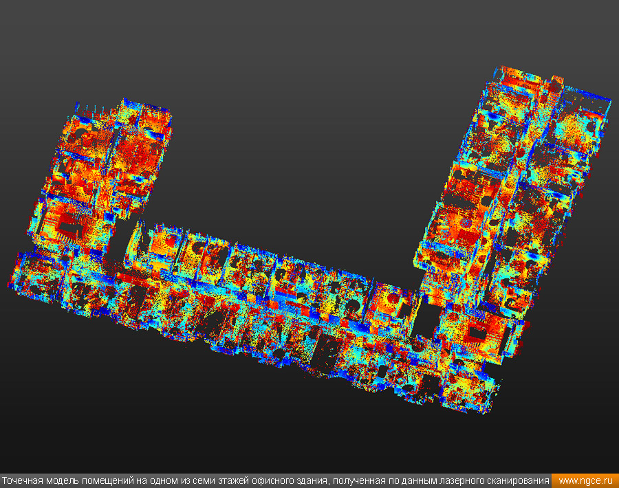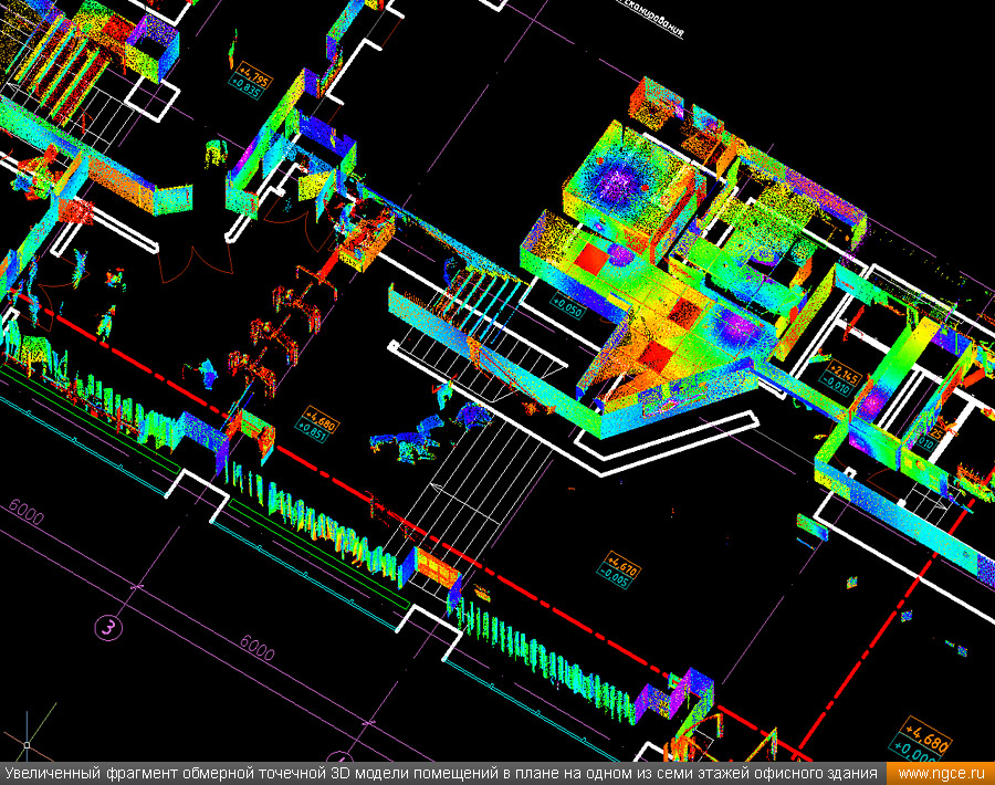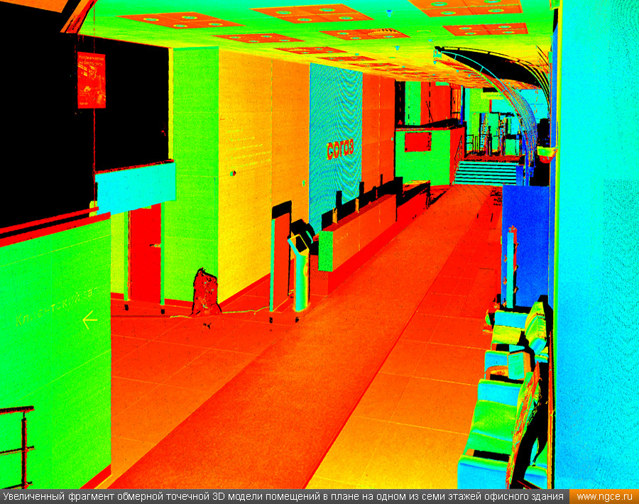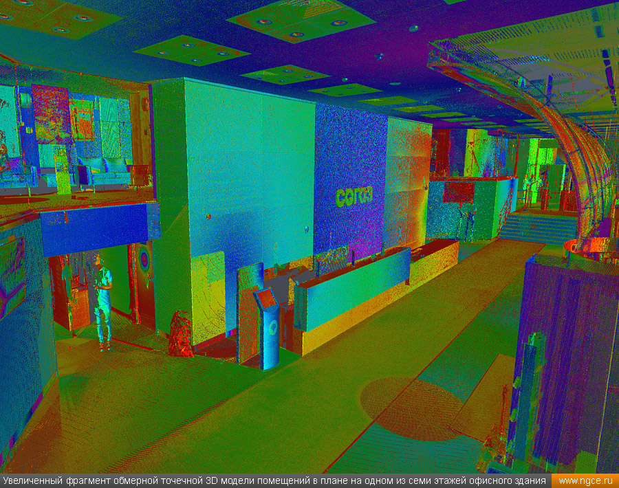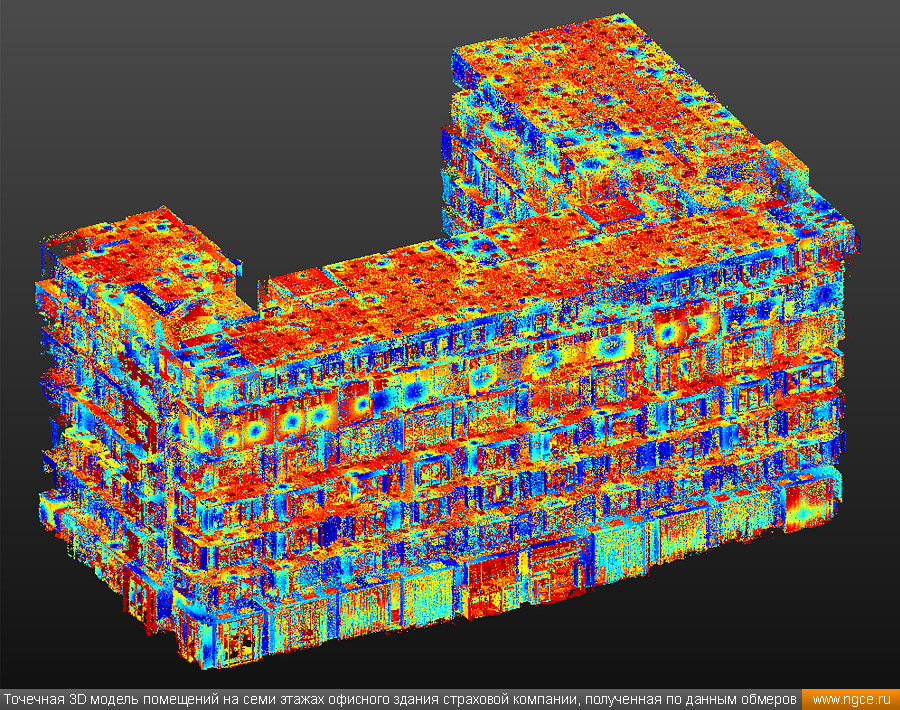 Специалисты инженерного предприятия «НГКИ» выполнили 3D обмеры офисных помещений на семи этажах здания крупной страховой компании в Москве. Обмерные работы были произведены нами методом лазерного сканирования при помощи 3D системы Leica RTC360 по заказу архитектурного бюро для целей подготовки проекта реконструкции и дизайна интерьеров. Лазерное сканирование офисных помещений страховой компании в центре МосквыПредставители архитектурного бюро, которому собственно и была поручена разработка этого проекта реконструкции и дизайна интерьеров офисных помещений в здании страховой компании, обратились к нам с просьбой произвести на данном объекте трёхмерное лазерное сканирование, а затем подготовить полный комплект обмерных чертежей, то есть исполнительную документацию. Подготовка проекта реконструкции большого офиса страховой компании предполагала проведение 3D обмерных работ в два этапа: сначала в действующих рабочих помещениях по имеющейся отделке, а затем в пустых помещениях после проведения демонтажа временных строительных конструкций (перегородок, подвесных потолков, фальшстен и прочего). Обмерные работы были произведены нами методом лазерного сканирования при помощи 3D системы Leica RTC360, которая представляет собой высокоточный прибор, позволяющий в автоматическом режиме проводить до 2 миллионов измерений в секунду, при этом точность каждого единичного измерения для определения пространственных координат составляет 1 мм. Обмеры проводились в действующем офисе в нерабочее время в вечерние и ночные часы, и таким образом за шесть вечеров нами были обмерены помещения на семи этажах здания общей площадью 8500 квадратных метров. Обработка данных лазерного сканирования и создание обмерных чертежей помещенийНа камеральном этапе работ полученные в результате обмерных работ сканы были очищены от посторонних шумов и лишних объектов, а затем сшиты в единое облако точек лазерного сканирования, представляющее собой точечную 3D модель объекта в стандартном формате RCP (Autodesk ReCaP) с возможностью просмотра 3D панорам с каждой станции лазерного сканирования. Далее по полученной точечной обмерной 3D модели нашими инженерами были построены точные обмерные чертежи: поэтажные планы, разрезы и развёртки стен по каждому из семи этажей. Весь камеральный этап работ, включивший в себя обработку, очистку и сшивку данных лазерного сканирования, а также подготовку полного комплекта обмерных чертежей офисных помещений общей площадью около 8500 квадратных метров, занял у наших специалистов около полутора месяцев. Полученная нами в итоге исполнительная документация была передана нашему Заказчику, архитектурному бюро, и его специалисты приступили к разработке проекта реконструкции. Заказчик остался очень доволен отличным качеством и высокой точностью полученных отчётных материалов, а также оперативностью выполнения работ нашими инженерами. Инженерное предприятие «НГКИ» на протяжении многих лет профессионально занимается производством обмерных работ жилых и нежилых помещений для целей подготовки дизайн-проектов оформления внутреннего обустройства. Мы занимаемся обмерами квартир, коттеджей, дачных домов, офисных и торговых помещений, торговых павильонов с точной фиксацией всех коммуникаций. Наши специалисты при проведении обмерны