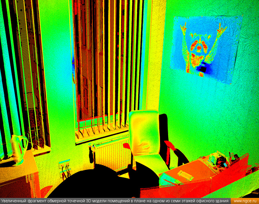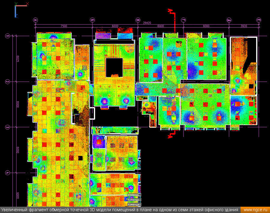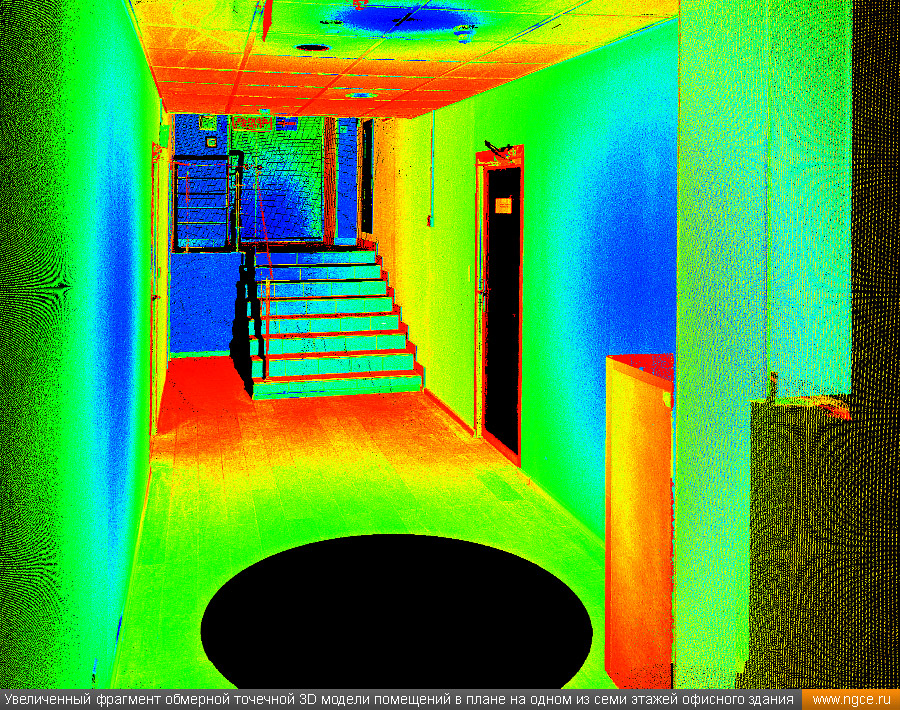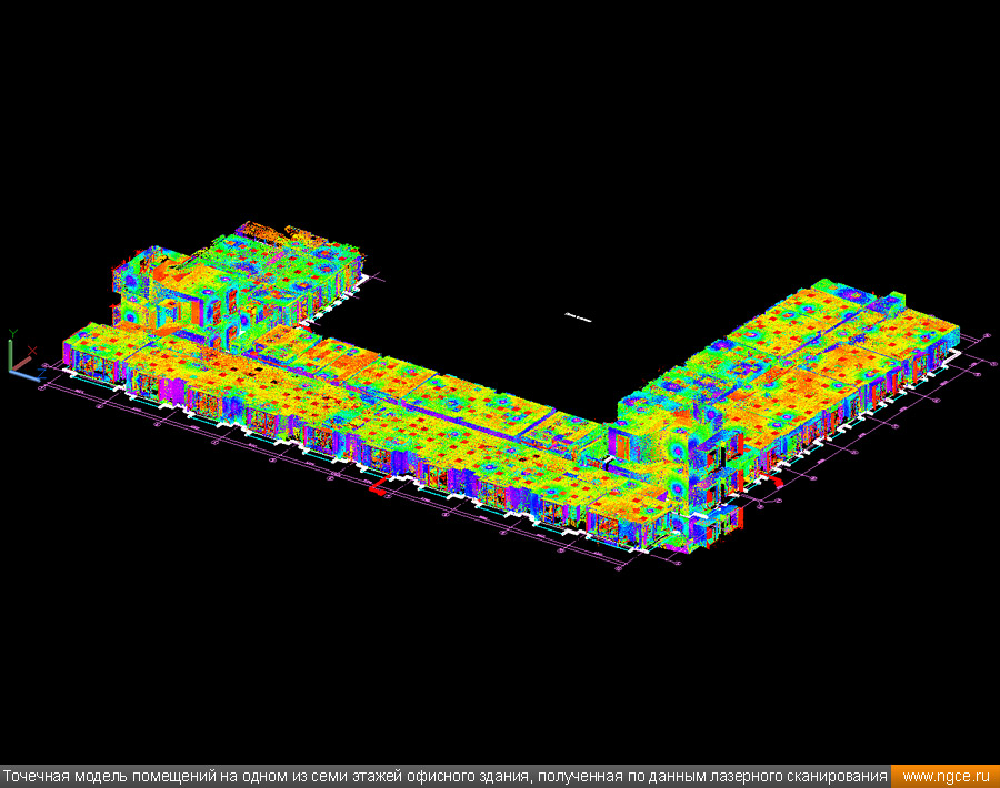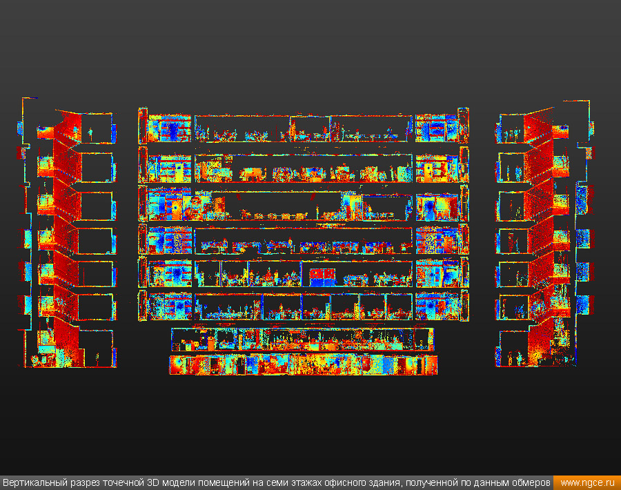 Специалисты инженерного предприятия «НГКИ» выполнили 3D обмеры офисных помещений на семи этажах здания крупной страховой компании в Москве. Обмерные работы были произведены нами методом лазерного сканирования при помощи 3D системы Leica RTC360 по заказу архитектурного бюро для целей подготовки проекта реконструкции и дизайна интерьеров. Лазерное сканирование офисных помещений страховой компании в центре МосквыПредставители архитектурного бюро, которому собственно и была поручена разработка этого проекта реконструкции и дизайна интерьеров офисных помещений в здании страховой компании, обратились к нам с просьбой произвести на данном объекте трёхмерное лазерное сканирование, а затем подготовить полный комплект обмерных чертежей, то есть исполнительную документацию. Подготовка проекта реконструкции большого офиса страховой компании предполагала проведение 3D обмерных работ в два этапа: сначала в действующих рабочих помещениях по имеющейся отделке, а затем в пустых помещениях после проведения демонтажа временных строительных конструкций (перегородок, подвесных потолков, фальшстен и прочего). Обмерные работы были произведены нами методом лазерного сканирования при помощи 3D системы Leica RTC360, которая представляет собой высокоточный прибор, позволяющий в автоматическом режиме проводить до 2 миллионов измерений в секунду, при этом точность каждого единичного измерения для определения пространственных координат составляет 1 мм. Обмеры проводились в действующем офисе в нерабочее время в вечерние и ночные часы, и таким образом за шесть вечеров нами были обмерены помещения на семи этажах здания общей площадью 8500 квадратных метров. Обработка данных лазерного сканирования и создание обмерных чертежей помещенийНа камеральном этапе работ полученные в результате обмерных работ сканы были очищены от посторонних шумов и лишних объектов, а затем сшиты в единое облако точек лазерного сканирования, представляющее собой точечную 3D модель объекта в стандартном формате RCP (Autodesk ReCaP) с возможностью просмотра 3D панорам с каждой станции лазерного сканирования. Далее по полученной точечной обмерной 3D модели нашими инженерами были построены точные обмерные чертежи: поэтажные планы, разрезы и развёртки стен по каждому из семи этажей. Весь камеральный этап работ, включивший в себя обработку, очистку и сшивку данных лазерного сканирования, а также подготовку полного комплекта обмерных чертежей офисных помещений общей площадью около 8500 квадратных метров, занял у наших специалистов около полутора месяцев. Полученная нами в итоге исполнительная документация была передана нашему Заказчику, архитектурному бюро, и его специалисты приступили к разработке проекта реконструкции. Заказчик остался очень доволен отличным качеством и высокой точностью полученных отчётных материалов, а также оперативностью выполнения работ нашими инженерами. Инженерное предприятие «НГКИ» на протяжении многих лет профессионально занимается производством обмерных работ жилых и нежилых помещений для целей подготовки дизайн-проектов оформления внутреннего обустройства. Мы занимаемся обмерами квартир, коттеджей, дачных домов, офисных и торговых помещений, торговых павильонов с точной фиксацией всех коммуникаций. Наши специалисты при проведении обмерны