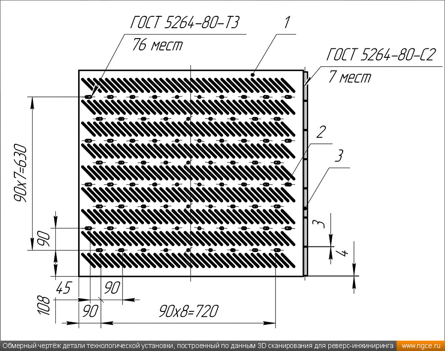 Специалисты инженерной компании «НГКИ» выполнили проект по 3D сканированию, трёхмерному моделированию и подготовке точных обмерных чертежей детали технологической установки на целлюлозно-бумажном комбинате в Московской области. Обмерные работы, 3D моделирование и построение обмерных чертежей были произведены нами для целей реверс-инжиниринга, дальнейшего проектирования и последующего производства копии этой детали на территории России в рамках программы импортозамещения. Высокоточные 3D обмеры детали установки на комбинате для реверс-инжинирингаПрецизионные 3D обмеры детали под названием «сито» от технологической установки на целлюлозно-бумажном комбинате были проведены нашим высокоточным портативным ручным 3D сканером ScanTech KSCAN-Magic, который обеспечивает высочайшую точность до 0,02 мм и выдаёт великолепную детализацию. Данная современная система ориентирована на высокоточную оцифровку объектов 3D сканирования, она оснащена лазерами двух разных типов (синий и красный) и обеспечивает прецизионную точность данных измерений. Полевой этап работ, на котором и было произведено высокоточное 3D сканирование этой детали, занял всего лишь три часа. На этом полевой этап был завершён, и наши специалисты приступили к камеральному этапу работ, который стал более длительным и трудоёмким. Обработка данных 3D сканирования, получение STL моделей и построение STP моделейУспешно завершив все полевые работы, наши специалисты вернулись в московский офис и приступили к выполнению камерального этапа работ по данному проекту. Первым делом была произведена обработка результатов данных всех выполненных измерений, осуществлена сшивка сделанных на полевом этапе сканов и затем получена точная трёхмерная триангуляционная обмерная модель этой детали технологической установки в формате STL. Скриншоты триангуляционной 3D модели данного объекта съёмки в формате STL, полученной в результате обработки данных 3D сканирования, вы можете посмотреть ниже. На следующей стадии камеральных работ по триангуляционным моделям были построены твердотельные 3D модели детали установки в формате STP. Примеры скриншотов обмерной 3D модели в формате STP, построенной по данным 3D сканирования, вы можете посмотреть ниже. Построение обмерных чертежей детали технологической установкиНа финальном этапе работ по этому проекту нашими специалистами были построены точные обмерные чертежи детали в формате DWG (AutoCAD). Примеры обмерных чертежей, созданных по данным 3D сканирования, вы можете посмотреть ниже. Заказчик остался очень доволен отличным качеством и высокой точностью полученных отчётных материалов, а также оперативностью выполнения работ нашими инженерами. Инженерная компания «НГКИ» имеет большой опыт высокоточных обмеров различных деталей, элементов декора, других мелких и средних объектов высокоточными сканерами. Мы занимаемся обмерами для решения задач реверс-инжиниринга (reverse engineering) деталей и изделий промышленного производства, ювелирных изделий, сувениров, элементов декора, а также задач для реставраторов, скульпторов, музейных работников, для сохранения данных об объектах историко-культурного наследия. Кроме того, наши высокоточные 3D сканеры применяются в метрологии, архитектуре, контроле качества, медицине, научных исследованиях, разработке разнообраз