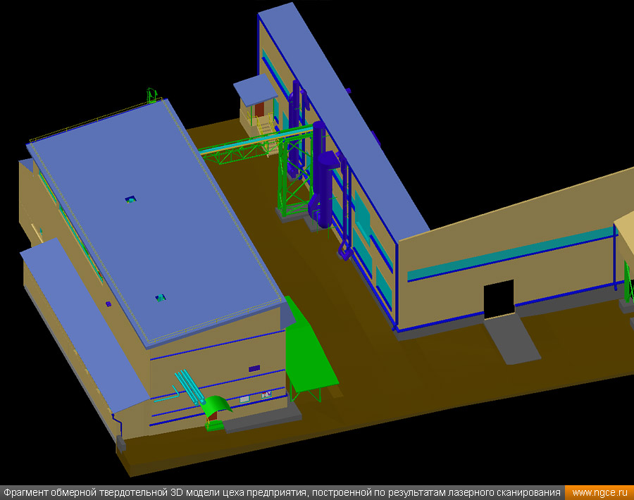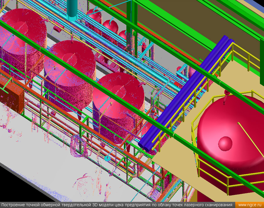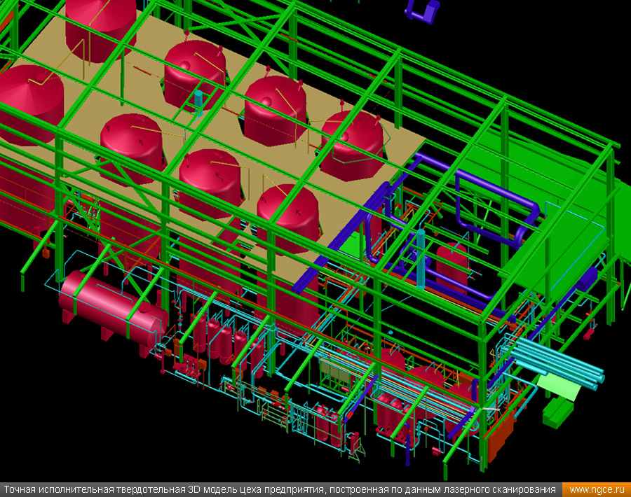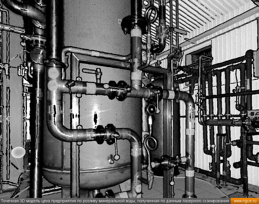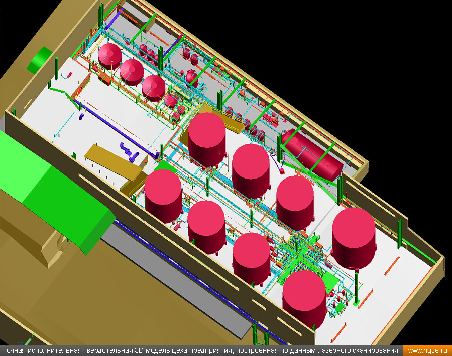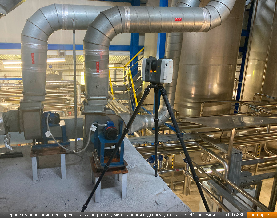 Инженерная компания «НГКИ» выполнила проект по обмерным работам и построению точной цифровой 3D модели цеха производственного комплекса по розливу минеральной воды, который находится в Сибирском регионе. Обмеры цеха площадью 550 квадратных метров, а также части территории снаружи с переходом в соседнее производственное здание были осуществлены нашими специалистами по технологии лазерного сканирования 3D системой Leica RTC360 для целей актуализации проектной документации и подготовки проекта реконструкции и расширения производства. 3D обмеры цеха предприятия методом лазерного сканирования для реконструкцииК нам обратились представители проектной организации, которой была поручена разработка проекта реконструкции, модернизации и расширения цеха производственного комплекса по розливу минеральной воды, с просьбой провести 3D обмеры цеха и предоставить их специалистам точную твердотельную обмерную модель объекта. Целью работ являлось лазерное сканирование и 3D моделирование цеха площадью 550 квадратных метров, а также территории снаружи с переходом в соседнее производственное здание. 3D обмеры цеха, плотно наполненного разнообразным технологическим оборудованием, были осуществлены нашими инженерами по технологии лазерного сканирования с помощью системы Leica RTC360. Лазерное сканирование цеха заняло один рабочий день, в общей сложности было выполнено 140 сканов. Трёхмерный лазерный сканер Leica RTC360 — высокоточный прибор, дающий возможность в автоматическом режиме проводить до 2 миллионов измерений в секунду, при этом точность каждого единичного измерения для определения пространственных координат составляет 1 мм. Важной особенностью этого 3D сканера является автоматическое выравнивание точно по горизонту на аппаратном уровне. Сам лазерный сканер может быть наклонён физически, а результаты измерений всё равно получаются точно выравненными по горизонту. Эта функция очень сильно экономит время при перестановке 3D сканера. Также сканер Leica RTC360 благодаря своей компактности и небольшой массе позволяет быстро проводить лазерное сканирование стеснённых помещений, таких как плотно насыщенные технологическим оборудованием цеха промышленных предприятий. Обработка данных лазерного сканирования и создание точной обмерной 3D модели цехаНа камеральном этапе работ по проекту была проведена сшивка облаков точек лазерного сканирования и их очистка от посторонних шумов и лишних объектов. Далее наши специалисты приступили к построению точной и подробной обмерной 3D модели цеха со всем технологическим оборудованием, инженерными коммуникациями и строительными конструкциями в программном комплексе AutoCAD. В процессе построения детальной твердотельной 3D модели цеха нашими специалистами были отмоделированы все отсканированные на полевом этапе работ объекты: По причине очень большого количества объектов, подлежащих моделированию, а также их крайне высокой плотности размещения внутри цеха, создание обмерной цифровой 3D модели цеха производилось в течение 18 дней. Исполнительная 3D модель цеха, созданная по данным лазерного сканированияВ результате всех выполненных работ по этому проекту нашими специалистами была получена точная и подробная обмерная 3D модель цеха предприятия со всем оборудованием, инженерными коммуникациями и стр