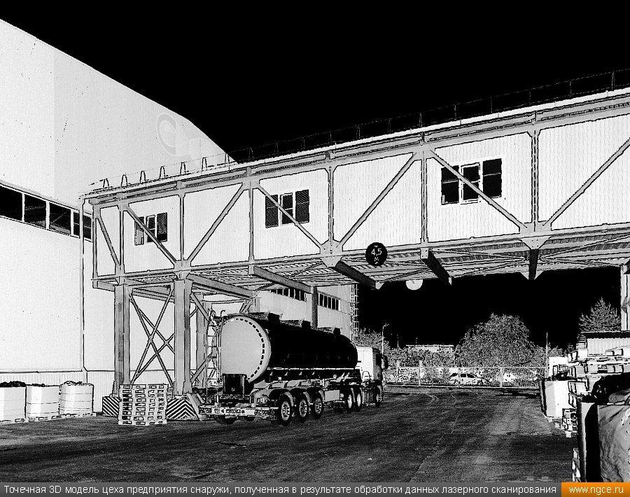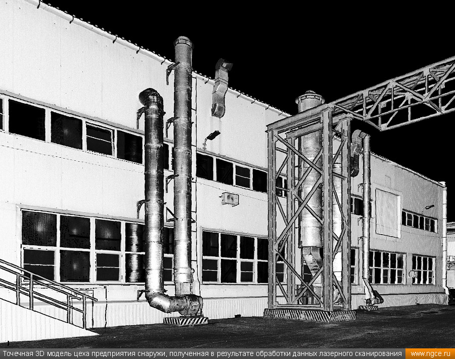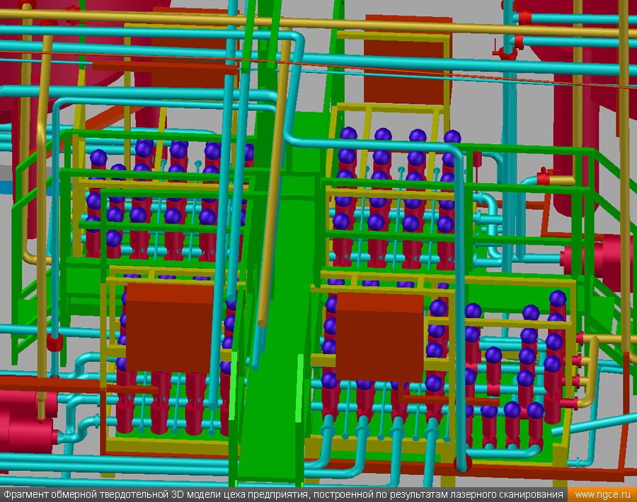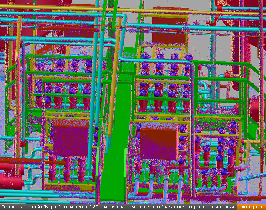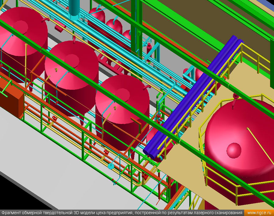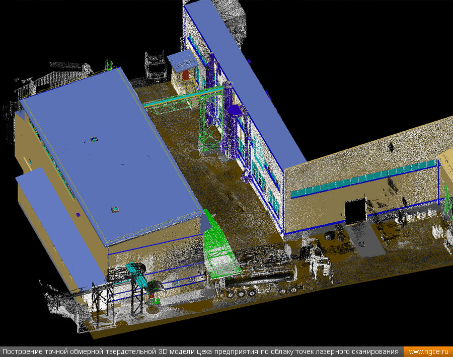Инженерная компания «НГКИ» выполнила проект по обмерным работам и построению точной цифровой 3D модели цеха производственного комплекса по розливу минеральной воды, который находится в Сибирском регионе. Обмеры цеха площадью 550 квадратных метров, а также части территории снаружи с переходом в соседнее производственное здание были осуществлены нашими специалистами по технологии лазерного сканирования 3D системой Leica RTC360 для целей актуализации проектной документации и подготовки проекта реконструкции и расширения производства. 3D обмеры цеха предприятия методом лазерного сканирования для реконструкцииК нам обратились представители проектной организации, которой была поручена разработка проекта реконструкции, модернизации и расширения цеха производственного комплекса по розливу минеральной воды, с просьбой провести 3D обмеры цеха и предоставить их специалистам точную твердотельную обмерную модель объекта. Целью работ являлось лазерное сканирование и 3D моделирование цеха площадью 550 квадратных метров, а также территории снаружи с переходом в соседнее производственное здание. 3D обмеры цеха, плотно наполненного разнообразным технологическим оборудованием, были осуществлены нашими инженерами по технологии лазерного сканирования с помощью системы Leica RTC360. Лазерное сканирование цеха заняло один рабочий день, в общей сложности было выполнено 140 сканов. Трёхмерный лазерный сканер Leica RTC360 — высокоточный прибор, дающий возможность в автоматическом режиме проводить до 2 миллионов измерений в секунду, при этом точность каждого единичного измерения для определения пространственных координат составляет 1 мм. Важной особенностью этого 3D сканера является автоматическое выравнивание точно по горизонту на аппаратном уровне. Сам лазерный сканер может быть наклонён физически, а результаты измерений всё равно получаются точно выравненными по горизонту. Эта функция очень сильно экономит время при перестановке 3D сканера. Также сканер Leica RTC360 благодаря своей компактности и небольшой массе позволяет быстро проводить лазерное сканирование стеснённых помещений, таких как плотно насыщенные технологическим оборудованием цеха промышленных предприятий. Обработка данных лазерного сканирования и создание точной обмерной 3D модели цехаНа камеральном этапе работ по проекту была проведена сшивка облаков точек лазерного сканирования и их очистка от посторонних шумов и лишних объектов. Далее наши специалисты приступили к построению точной и подробной обмерной 3D модели цеха со всем технологическим оборудованием, инженерными коммуникациями и строительными конструкциями в программном комплексе AutoCAD. В процессе построения детальной твердотельной 3D модели цеха нашими специалистами были отмоделированы все отсканированные на полевом этапе работ объекты: По причине очень большого количества объектов, подлежащих моделированию, а также их крайне высокой плотности размещения внутри цеха, создание обмерной цифровой 3D модели цеха производилось в течение 18 дней. Исполнительная 3D модель цеха, созданная по данным лазерного сканированияВ результате всех выполненных работ по этому проекту нашими специалистами была получена точная и подробная обмерная 3D модель цеха предприятия со всем оборудованием, инженерными коммуникациями и стр