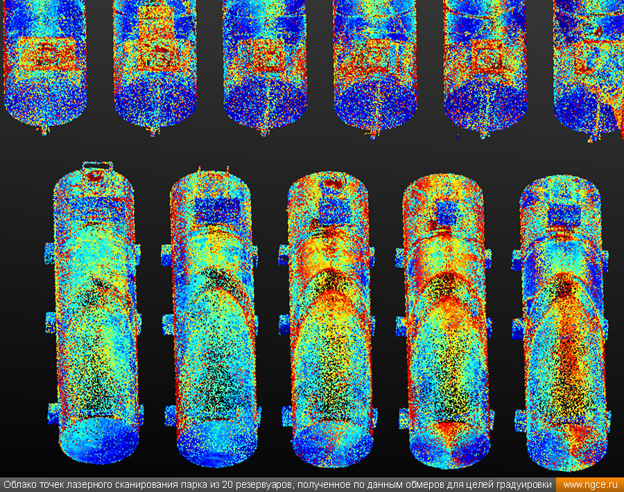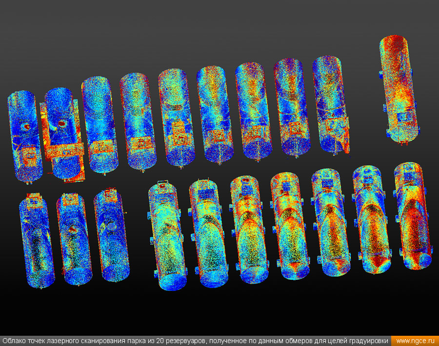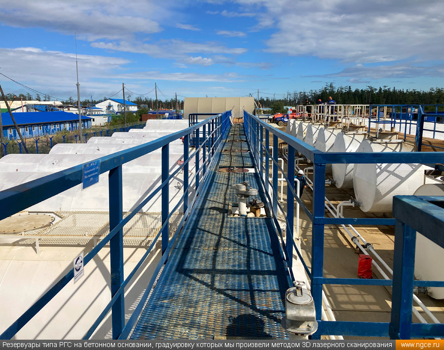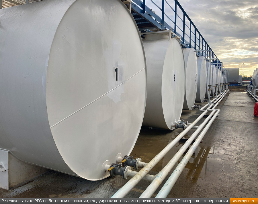 Специалисты инженерной компании «НГКИ» оперативно выполнили интересный проект по точной градуировке парка из двадцати резервуаров типа РГС-50 и РГС-60 на острове Сахалин. Обмерные работы на объекте были произведены нами по технологии 3D лазерного сканирования. Для данных целей отлично подошёл лазерный сканер Leica RTC360. Калибровка наземных резервуаров с учётом углов их наклона относительно поверхностиК нам обратилась компания, имеющая на востоке Сахалина парк из двадцати горизонтальных стальных резервуаров РГС-50 и РГС-60, установленных на бетонном основании, но при этом всё равно меняющих свой наклон каждый сезон из-за сильного пучения грунта. Резервуарный парк располагается на Сахалине в местности с большим объёмом сезонных дождей, внушительными сезонными перепадами температуры и пучинистыми грунтами, и по этой причине установка резервуаров на бетонное основание не гарантирует постоянное положение резервуара, поскольку грунт нестабилен и подвижен. В зависимости от времени года, резервуары меняют угол наклона как вокруг поперечной оси (аналог корабельного дифферента), так и вокруг продольной оси (аналог крена). Сезонные изменения углов «дифферента» и «крена» настолько велики, что Заказчик вынужден с ними считаться и производить градуировку РГС с учётом меняющихся углов наклона резервуаров в ту или иную сторону. Заказчик поставил перед нами задачу учесть эти наклоны в итоговых градуировочных таблицах, чтобы при выполнении замеров метролог Заказчика мог определять текущий наклон каждого из 20 резервуаров и направление этого наклона, в итоге получая более точный объём продукта в любом отдельно взятом резервуаре. Инженерная компания «НГКИ» имеет очень большой опыт точной калибровки резервуаров любого вида, в том числе и нефтеналивных танкеров. Как раз именно у судов и применяются такие понятия как «дифферент» и «крен». Дифферент — это разница между осадкой судна на корме и на носу; крен — наклон судна в поперечной плоскости, то есть вокруг продольной оси. В случае с резервуарами вместо носа и кормы используются противоположные днища резервуаров, а вместо бортов — боковые стенки. Градуировка наземных резервуаров и составление калибровочных таблицОбмерные работы для целей градуировки наземных резервуаров типа РГС на данном объекте были проведены нами по технологии лазерного сканирования 3D системой Leica RTC360. Трёхмерный лазерный сканер Leica RTC360 — высокоточный прибор, дающий возможность в автоматическом режиме проводить до 2 миллионов измерений в секунду, при этом точность каждого единичного измерения для определения пространственных координат составляет 1 мм. Важной особенностью этого 3D сканера является автоматическое выравнивание точно по горизонту на аппаратном уровне. Сам лазерный сканер может быть наклонён физически, а результаты измерений всё равно получаются точно выравненными по горизонту. Эта функция очень сильно экономит время при перестановке 3D сканера. Также сканер Leica RTC360 благодаря своей компактности и небольшой массе позволяет быстро проводить лазерное сканирование стеснённых помещений и узких проходов, что как раз очень актуально при обмерах резервуаров разных типов с их небольшими люками. Полевой этап работ, на котором нами были произведены 3D обмеры всех двадцати наливных резервуаров типа Р