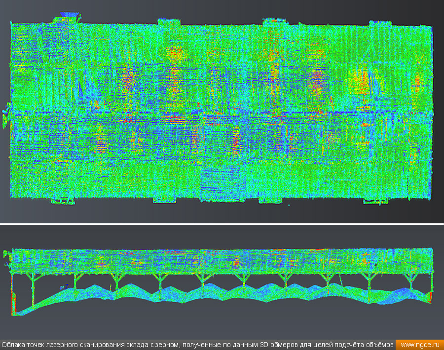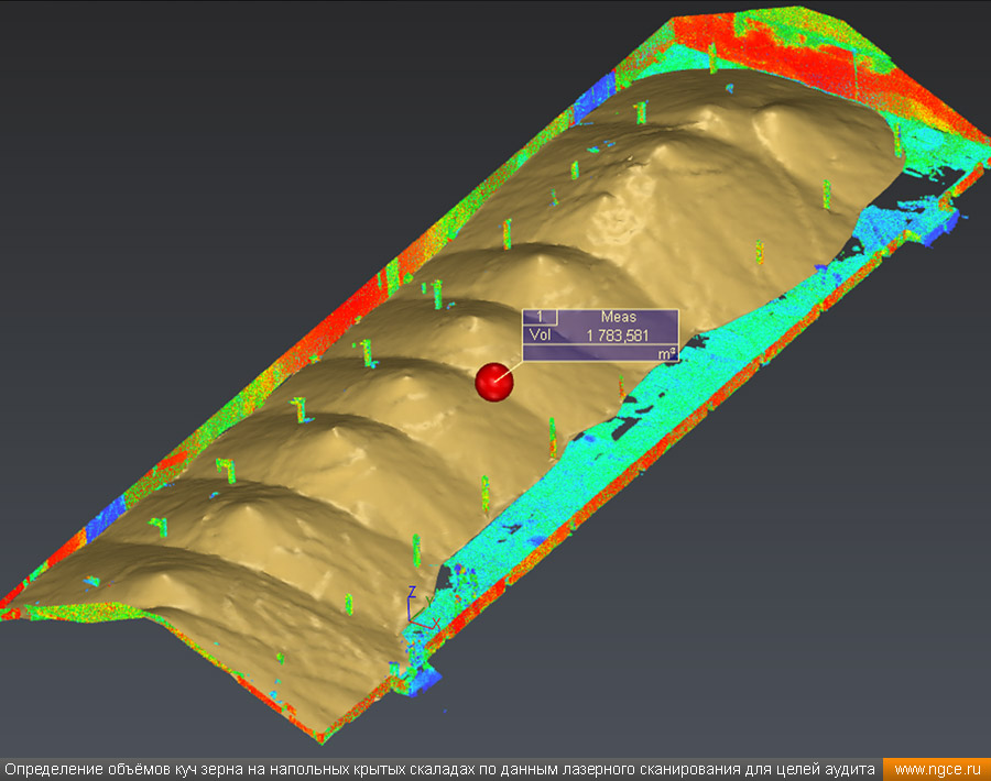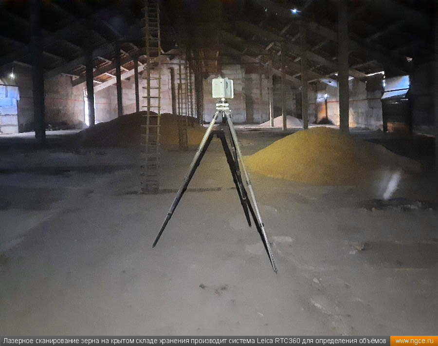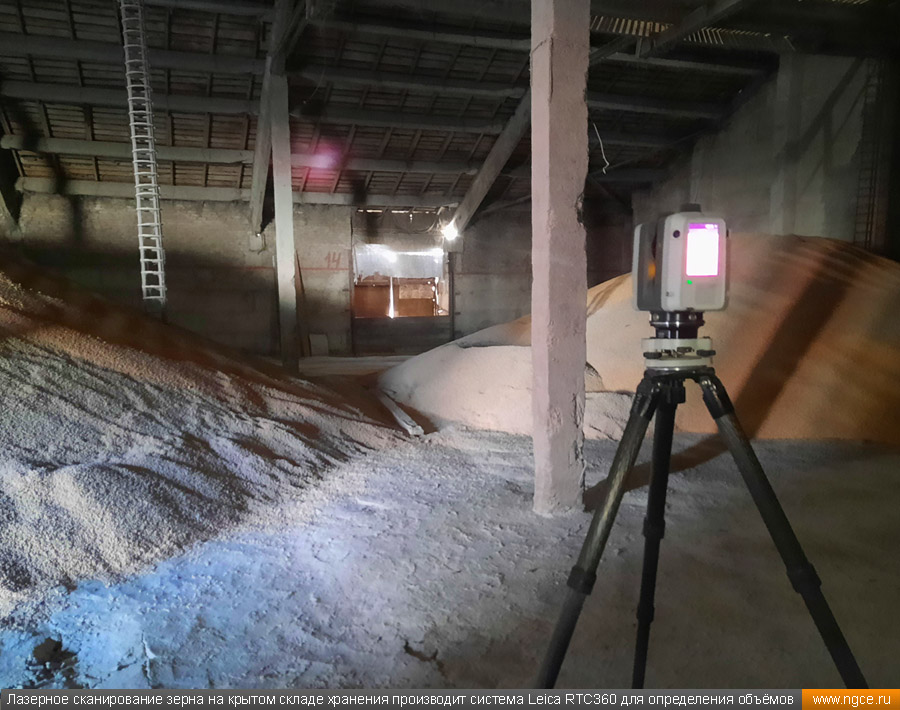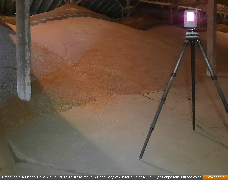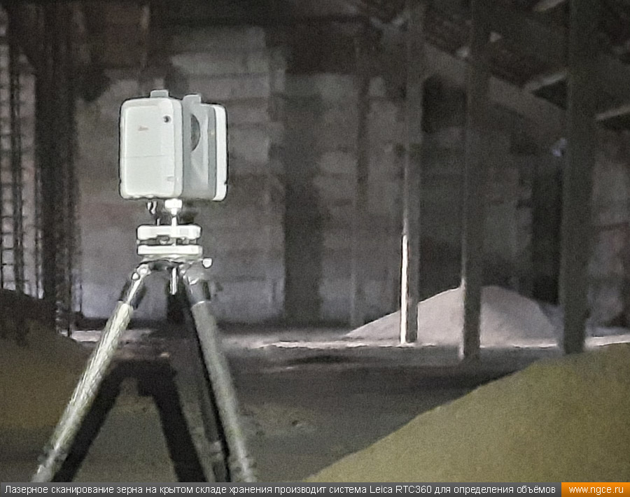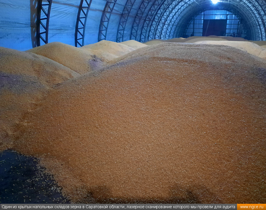 Инженерное предприятие «НГКИ» выполнили проект по точному определению объёмов зерна, хранящегося на крытых напольных складах в Саратовской области. Обмерные работы были осуществлены нашими специалистами методом лазерного сканирования 3D системой Leica RTC360 для целей аудита и учёта количества остатков зерна на хранении. Заказчиком всего данного комплекса работ выступил крупный агрохолдинг, проводящий инвентаризацию и внутренний аудит своих складских запасов зерна. Лазерное сканирование куч зерна на напольных складах для определения объёмовАудиторы крупных сельскохозяйственных холдингов проводят аудит объёма хранящегося урожая после окончания его закладки в конце года и перед новым урожаем в середине лета. Зерно хранится в силосах, напольных крытых складах или в «рукавах» (silobags) непосредственно в поле. В данном случае нашим инженерам было необходимо определить объёмы зерна на хранении в двух удалённых друг от друга локациях на напольных складах. Лазерное сканирование на нескольких локациях хранения зерна в двух разных населённых пунктах было произведено нашими специалистами за два рабочих дня при помощи универсальной 3D системы Leica RTC360. В одной локации инженерами нашей компании было обмерено одиннадцать крытых напольных складов, а во второй — шесть. Трёхмерный лазерный сканер Leica RTC360 — высокоточный прибор, дающий возможность в автоматическом режиме проводить до 2 миллионов измерений в секунду, при этом точность каждого единичного измерения для определения пространственных координат составляет 1 мм. Важной особенностью этого 3D сканера является автоматическое выравнивание точно по горизонту на аппаратном уровне. Сам лазерный сканер может быть наклонён физически, а результаты измерений всё равно получаются точно выравненными по горизонту. Эта функция очень сильно экономит время при перестановке 3D сканера. Места стоянок лазерного сканера рассчитывались таким образом, чтобы обеспечить максимальное покрытие каждого сканируемого объекта. Также лазерное сканирование осуществлялось с взаимным перекрытием сканов, необходимым и достаточным для последующей сшивки по общим контурам. Измерение объёмов хранения зерна на крытых напольных складахПо результатам лазерного сканирования нашими специалистами на камеральном этапе работ сначала были созданы точные обмерные цифровые 3D модели объектов, а затем выполнен подсчёт объёма зерна в каждом бурте на каждом складе хранения. Определение объёмов зерна в буртах на напольных крытых складах является самой стандартной и не очень сложной задачей, поскольку кучи зерна на таких обычных складах сложены навалом. В данном случае производится лазерное сканирование и 3D моделирование буртов зерна, затем строится отсчётная плоскость. При производстве обмеров насыпей (буртов) сельскохозяйственной продукции отсчётная плоскость (это подстилающая поверхность, на которой находится насыпь), всегда скрыта от средств измерений, поэтому отсутствует возможность построения её точной трёхмерной модели по результатам измерений. Также, как правило, отсутствует и возможность проведения обмеров и построения точных моделей поверхностей, ограничивающих насыпи с разных сторон. Так как для подсчёта объёма насыпи необходима замкнутая со всех сторон 3D модель насыпи, то для недоступных для 