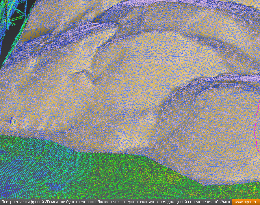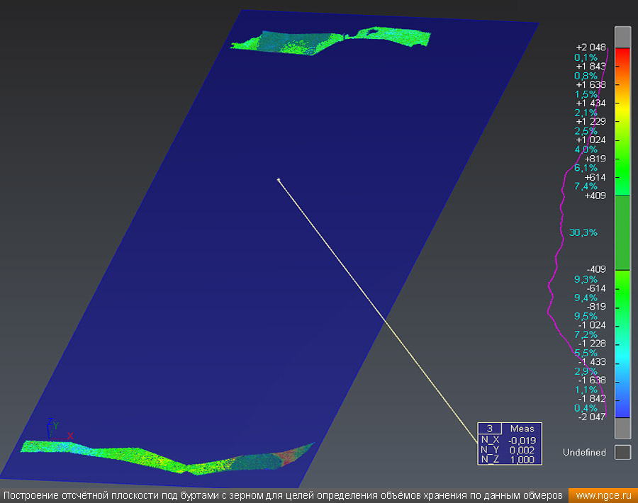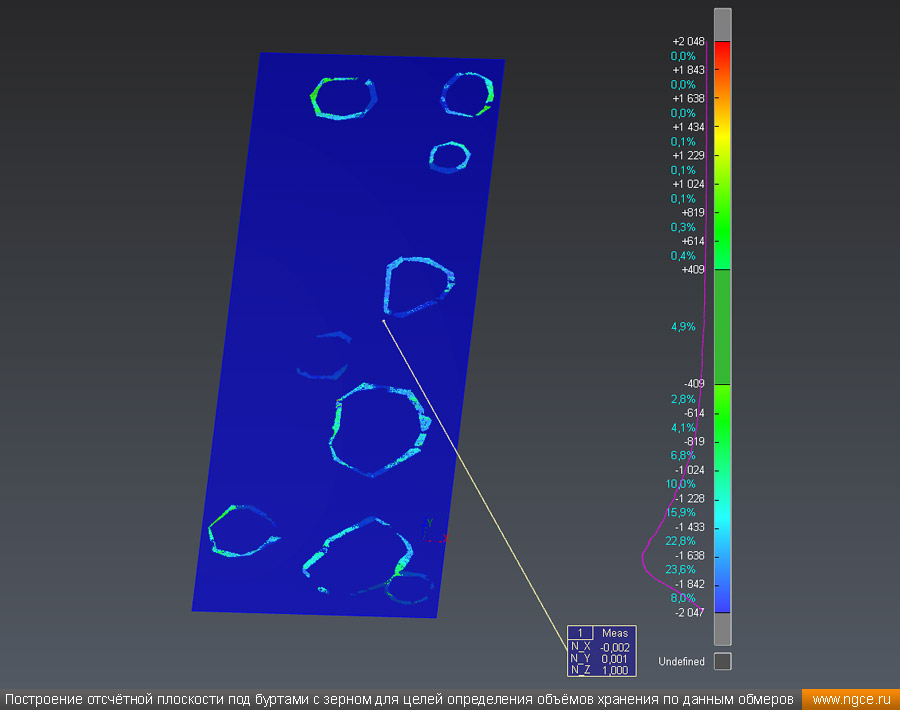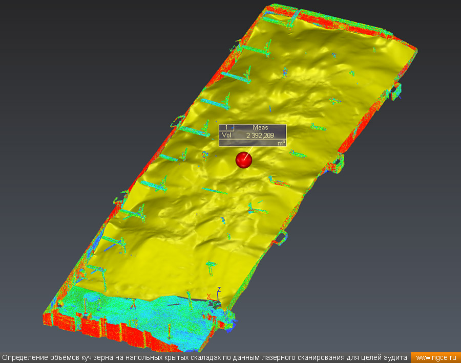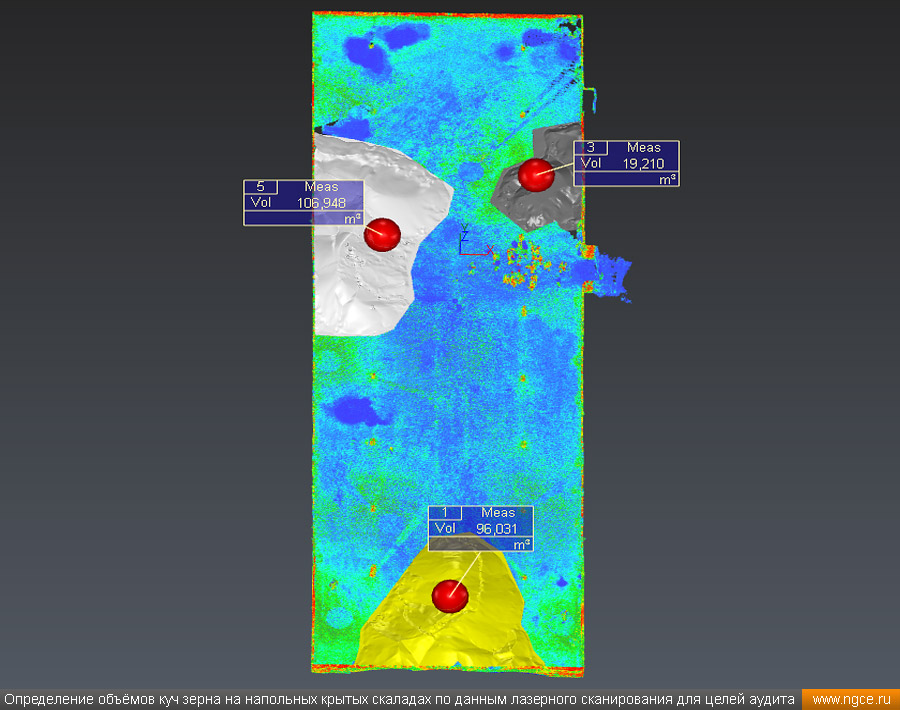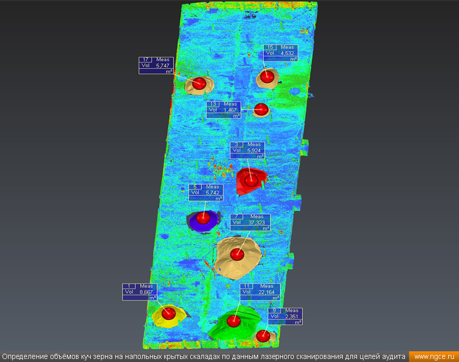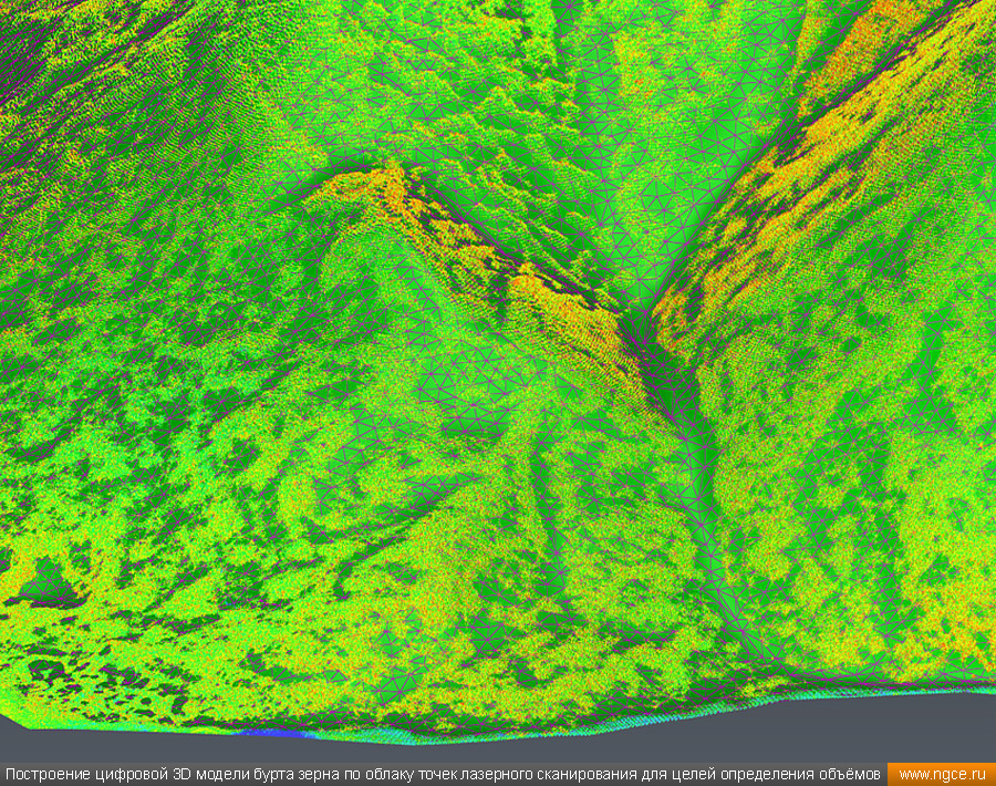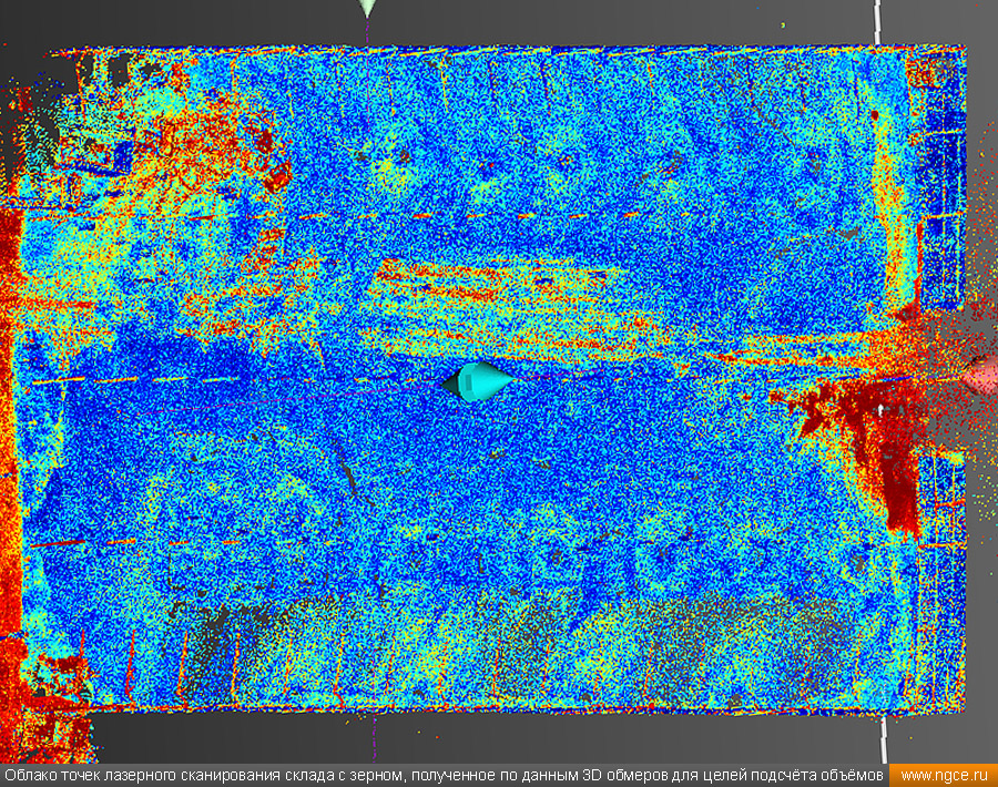 Инженерное предприятие «НГКИ» выполнили проект по точному определению объёмов зерна, хранящегося на крытых напольных складах в Саратовской области. Обмерные работы были осуществлены нашими специалистами методом лазерного сканирования 3D системой Leica RTC360 для целей аудита и учёта количества остатков зерна на хранении. Заказчиком всего данного комплекса работ выступил крупный агрохолдинг, проводящий инвентаризацию и внутренний аудит своих складских запасов зерна. Лазерное сканирование куч зерна на напольных складах для определения объёмовАудиторы крупных сельскохозяйственных холдингов проводят аудит объёма хранящегося урожая после окончания его закладки в конце года и перед новым урожаем в середине лета. Зерно хранится в силосах, напольных крытых складах или в «рукавах» (silobags) непосредственно в поле. В данном случае нашим инженерам было необходимо определить объёмы зерна на хранении в двух удалённых друг от друга локациях на напольных складах. Лазерное сканирование на нескольких локациях хранения зерна в двух разных населённых пунктах было произведено нашими специалистами за два рабочих дня при помощи универсальной 3D системы Leica RTC360. В одной локации инженерами нашей компании было обмерено одиннадцать крытых напольных складов, а во второй — шесть. Трёхмерный лазерный сканер Leica RTC360 — высокоточный прибор, дающий возможность в автоматическом режиме проводить до 2 миллионов измерений в секунду, при этом точность каждого единичного измерения для определения пространственных координат составляет 1 мм. Важной особенностью этого 3D сканера является автоматическое выравнивание точно по горизонту на аппаратном уровне. Сам лазерный сканер может быть наклонён физически, а результаты измерений всё равно получаются точно выравненными по горизонту. Эта функция очень сильно экономит время при перестановке 3D сканера. Места стоянок лазерного сканера рассчитывались таким образом, чтобы обеспечить максимальное покрытие каждого сканируемого объекта. Также лазерное сканирование осуществлялось с взаимным перекрытием сканов, необходимым и достаточным для последующей сшивки по общим контурам. Измерение объёмов хранения зерна на крытых напольных складахПо результатам лазерного сканирования нашими специалистами на камеральном этапе работ сначала были созданы точные обмерные цифровые 3D модели объектов, а затем выполнен подсчёт объёма зерна в каждом бурте на каждом складе хранения. Определение объёмов зерна в буртах на напольных крытых складах является самой стандартной и не очень сложной задачей, поскольку кучи зерна на таких обычных складах сложены навалом. В данном случае производится лазерное сканирование и 3D моделирование буртов зерна, затем строится отсчётная плоскость. При производстве обмеров насыпей (буртов) сельскохозяйственной продукции отсчётная плоскость (это подстилающая поверхность, на которой находится насыпь), всегда скрыта от средств измерений, поэтому отсутствует возможность построения её точной трёхмерной модели по результатам измерений. Также, как правило, отсутствует и возможность проведения обмеров и построения точных моделей поверхностей, ограничивающих насыпи с разных сторон. Так как для подсчёта объёма насыпи необходима замкнутая со всех сторон 3D модель насыпи, то для недоступных для 