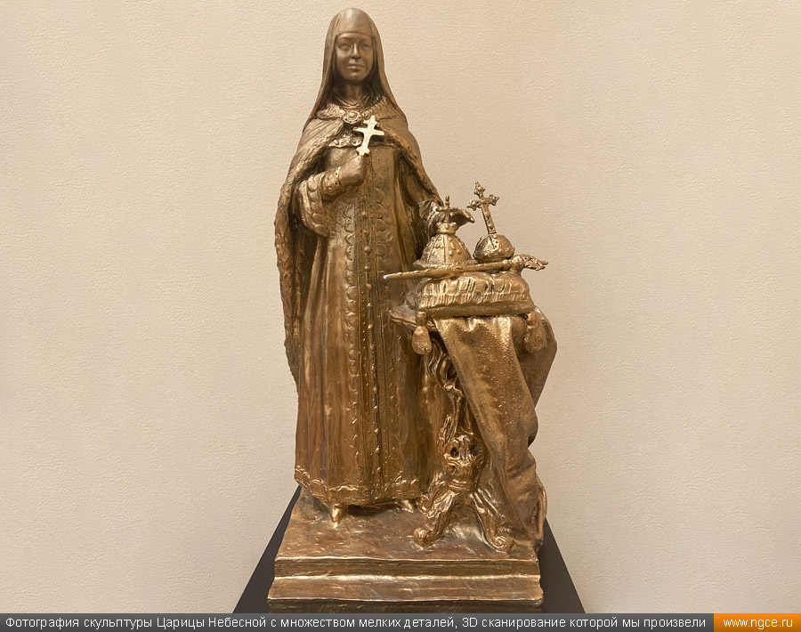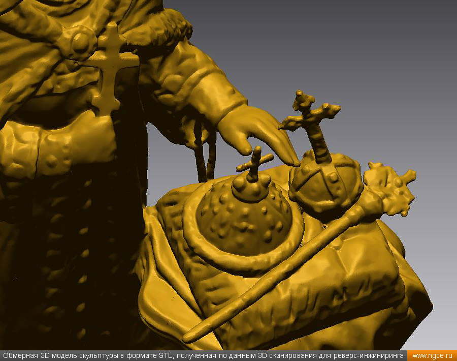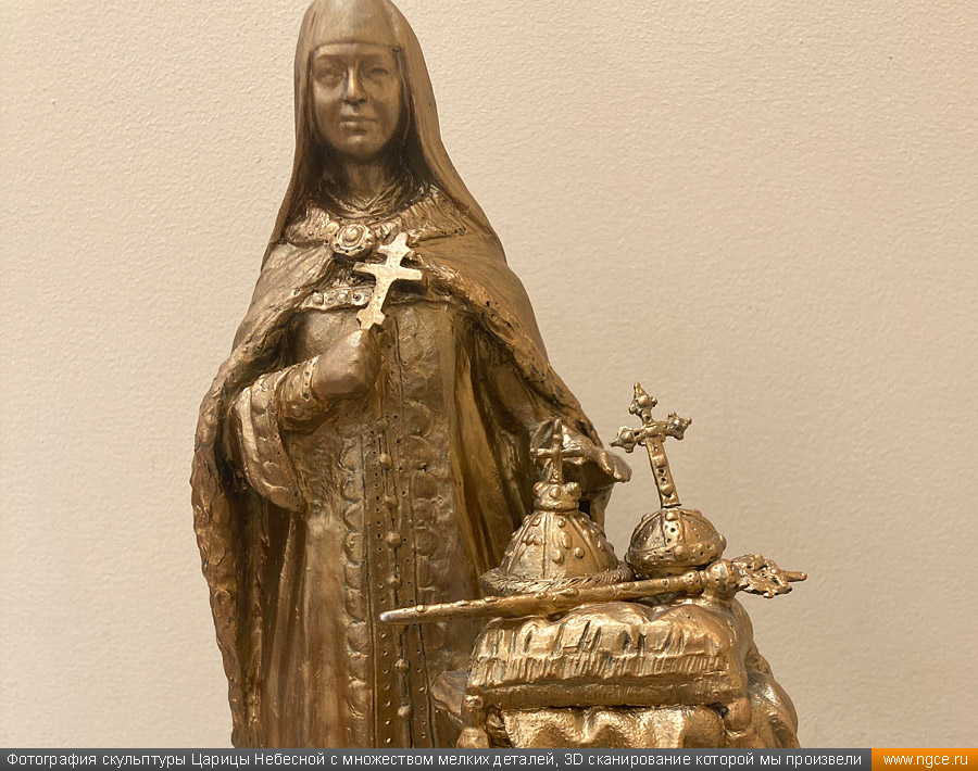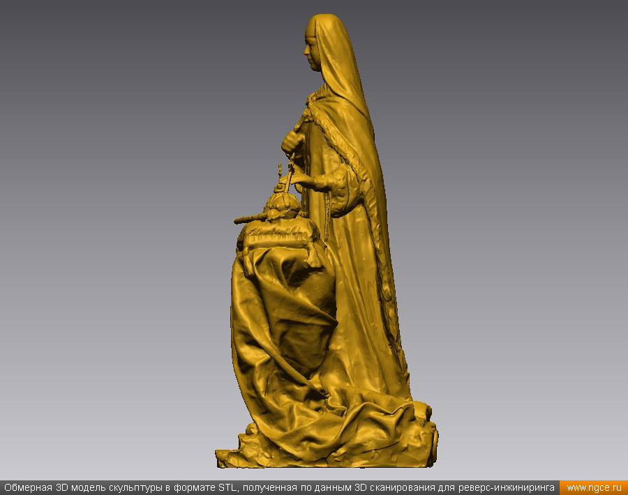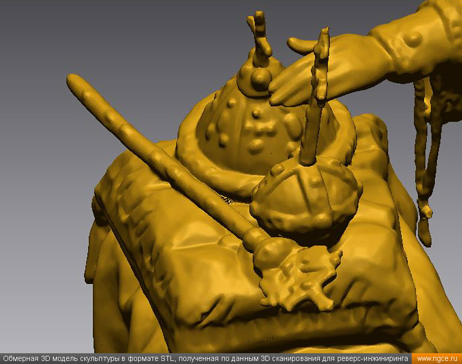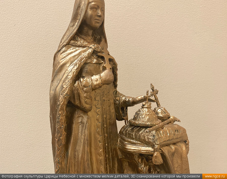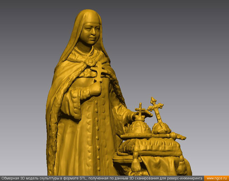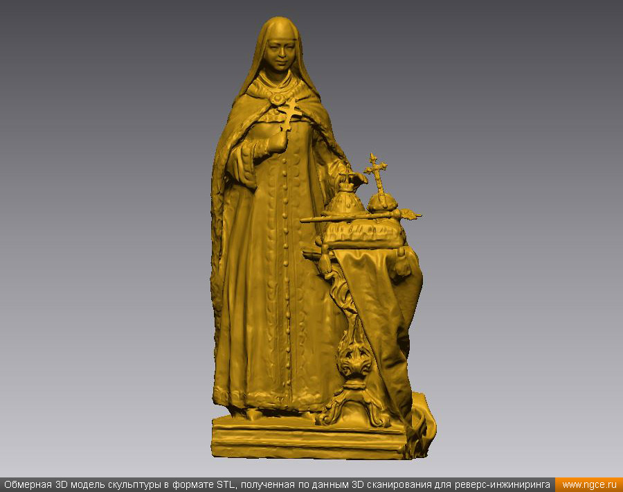 Специалисты инженерной компании «НГКИ» выполнили проект по 3D сканированию и трёхмерному моделированию скульптуры Царицы Небесной. Обмерные работы были проведены нами для целей реверс-инжиниринга, дальнейшего проектирования и последующего копирования этой скульптуры в любом масштабе. Высокоточные 3D обмеры скульптуры для целей реверс-инжиниринга3D обмеры скульптуры Царицы Небесной были произведены нашим ручным портативным высокоточным 3D сканером ScanTech KSCAN-Magic, который обеспечивает точность до 0,02 мм и при этом великолепную детализацию. Данная современная сканирующая 3D система ориентирована на высокоточную оцифровку объектов 3D сканирования, она оснащена лазерами двух разных типов (синий и красный) и обеспечивает прецизионную точность данных измерений. Среди особенностей этого проекта с точки зрения работ по 3D сканированию можно выделить высокую детализацию исполнения самой скульптуры царицы, которую нашим инженерам было необходимо отобразить с высокой точностью и на создаваемой обмерной 3D модели: например, множество складок одежды, а также сложные по форме элементы этой скульптурной композиции, такие как скипетр, держава, шапка Мономаха и крест на цепочке, висящий на запястье царицы. Размеры скульптуры Царицы Небесной составили 400х160х160 миллиметров. Первый этап работ, на котором и было проведено высокоточное 3D сканирование этой скульптуры, занял всего лишь около двух часов. На этом первый этап был завершён, и наши специалисты приступили к камеральному этапу работ, который стал также был довольно трудоёмким, но тоже был выполнен за несколько часов. Обработка данных 3D сканирования и получение STL моделейУспешно завершив все работы по высокоточному 3D сканированию скульптуры Царицы Небесной, наши специалисты приступили к выполнению камерального этапа работ по данному проекту. Первым делом была произведена обработка результатов данных всех выполненных измерений, осуществлена сшивка сделанных на полевом этапе сканов и затем получена точная трёхмерная триангуляционная обмерная модель этой скульптуры с высокой детализацией в формате STL. Именно эта 3D модель скульптуры Царицы Небесной и была передана Заказчику, который остался очень доволен оперативностью выполнения всех видов работ, а также высокой точностью и отличным качеством полученных материалов. Скриншоты итоговой триангуляционной 3D модели данного объекта съёмки в формате STL, полученной в результате обработки данных 3D сканирования, вы можете посмотреть ниже. Инженерная компания «НГКИ» имеет большой опыт высокоточных обмеров различных деталей, элементов декора, других мелких и средних объектов высокоточными сканерами. Мы занимаемся обмерами для решения задач реверс-инжиниринга (reverse engineering) деталей и изделий промышленного производства, ювелирных изделий, сувениров, элементов декора, а также задач для реставраторов, скульпторов, музейных работников, для сохранения данных об объектах историко-культурного наследия. Кроме того, наши высокоточные 3D сканеры применяются в метрологии, архитектуре, контроле качества, медицине, научных исследованиях, разработке разнообразных приложений VR/AR, ракетно-космической отрасли, авиа- и автомобилестроении, ИТ-сфере, медицине, криминалистике, кинематографе, моде, образовании, производстве товаров народного потреблени