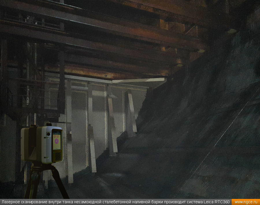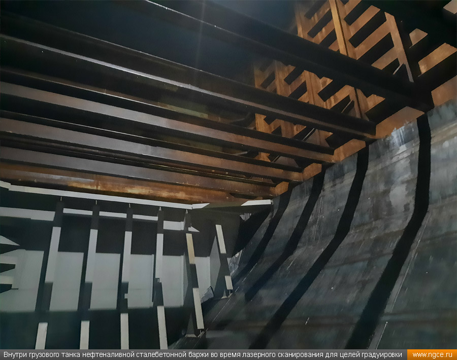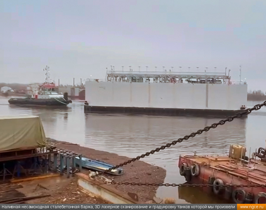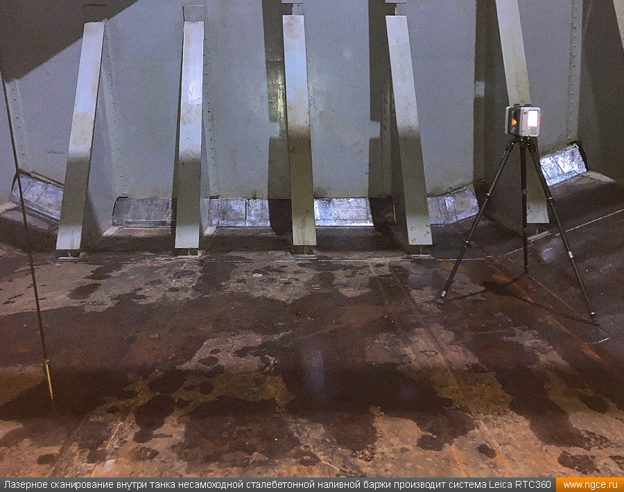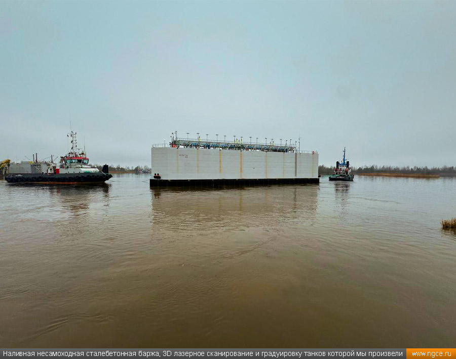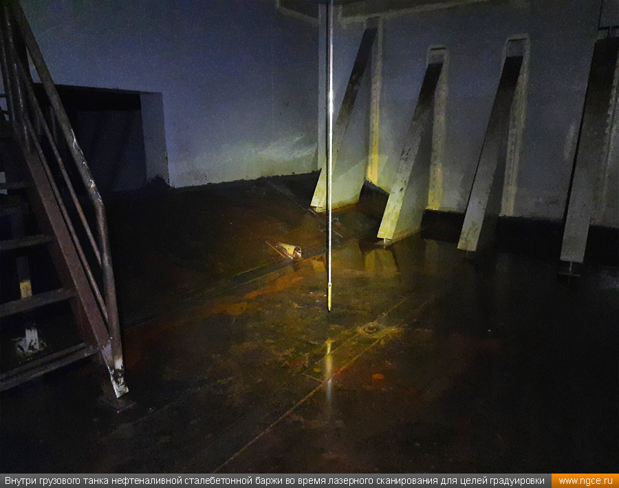 Специалистами инженерного предприятия «НГКИ» в городе Санкт-Петербург была осуществлена градуировка танков уникальной несамоходной наливной баржи «Необетон» проекта 04080. Уникальность данной баржи состоит в том, что она построена из сталебетона. Наливные баржи типа «Необетон» предназначаются для безопасного круглогодичного хранения нефтепродуктов, это судно может хранить до четырёх видов топлива сегрегированно. Нижняя часть корпуса этого судна выполнена из армированного железобетона, а верхняя его часть — из стали. Железобетонное основание обеспечивает возможность посадки судна на грунт во время эксплуатации. Плавучее нефтехранилище оборудовано восемью попарно соединёнными грузовыми танками. Точная калибровка танков геометрическим методом с помощью лазерного сканированияКалибровка резервуаров геометрическим методом с использованием технологии лазерного сканирования является для нашей компании обычной задачей: мы много лет осуществляем градуировку наземных и подземных резервуаров, судовых танков, а также различных типов цистерн и трубопроводов. Подобную работу мы провели в Санкт-Петербурге, оперативно осуществив лазерное сканирование и моделирование танков наливной сталебетонной баржи «Необетон» с составлением в конечном итоге градуировочных таблиц для каждого из восьми её танков. Градуировка больших резервуаров с применением технологии лазерного сканирования — это единственная методика получения градуировочных таблиц, которая за разумные деньги позволяет в сжатые сроки получить реальные объёмы продукта в танках и резервуарах, поскольку устаревший объёмный метод калибровки резервуаров требует гигантского количества воды или другого жидкого продукта, что влечёт за собой огромную стоимость работы, большие временные затраты и итоговую нецелесообразность его применения, не говоря о том, что утилизировать использованную воду вместе с остатками нефтепродуктов крайне проблематично. Также неоспоримым преимуществом геометрического метода градуировки резервуаров с применением 3D обмеров лазерным сканером является возможность проведения полевых работ практически в любую погоду (температурный диапазон от +30°C до -15°C) и в любое время суток. Для выполнения всех необходимых обмерных работ на наливном судне и градуировки резервуаров геометрическим методом необходимо всего два условия: Обмерные работы во всех восьми грузовых танках этой нефтеналивной баржи, которые представляют собой попарно соединённые между собой проёмами бетонные чаши с металлоконструкциями в верхней части, были осуществлены нашими инженерами методом лазерного сканирования с помощью 3D системы Leica RTC360. Трёхмерный лазерный сканер Leica RTC360 — высокоточный прибор, дающий возможность в автоматическом режиме проводить до 2 миллионов измерений в секунду, при этом точность каждого единичного измерения для определения пространственных координат составляет 1 мм. Важной особенностью этого 3D сканера является автоматическое выравнивание точно по горизонту на аппаратном уровне. Сам лазерный сканер может быть наклонён физически, а результаты измерений всё равно получаются точно выравненными по горизонту. Эта функция очень сильно экономит время при перестановке 3D сканера. 3D моделирование и составление градуировочных таблиц танко