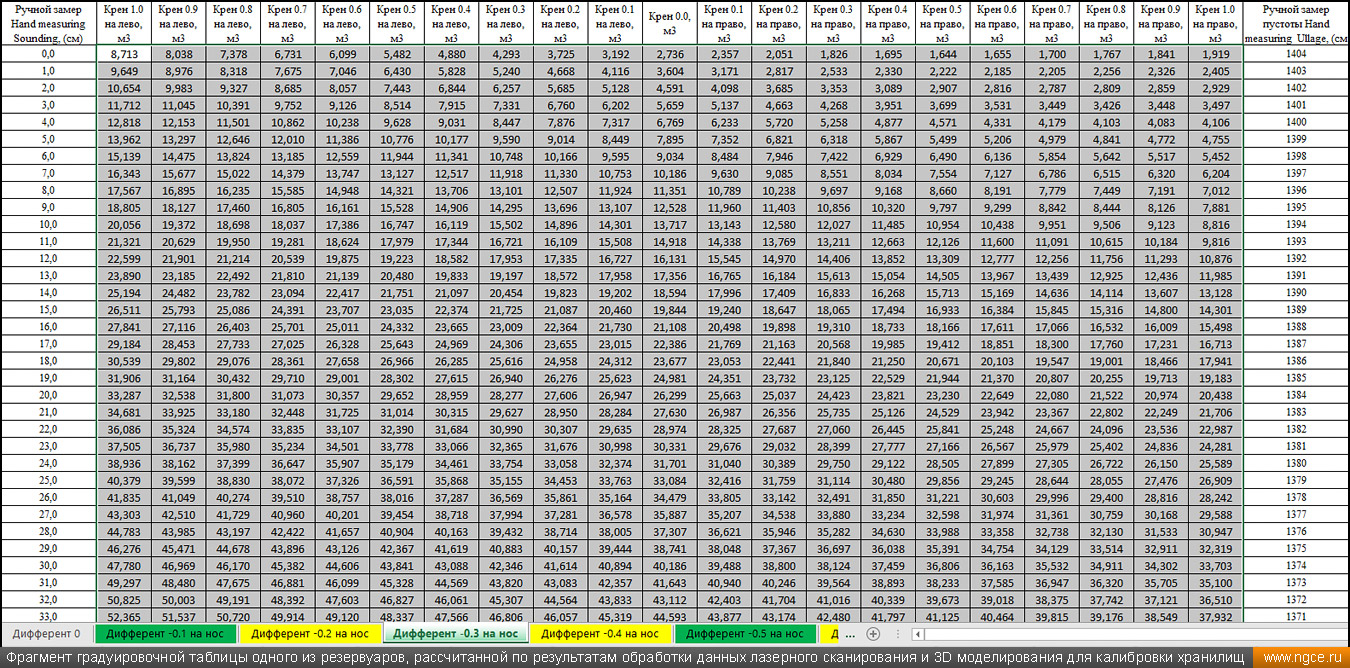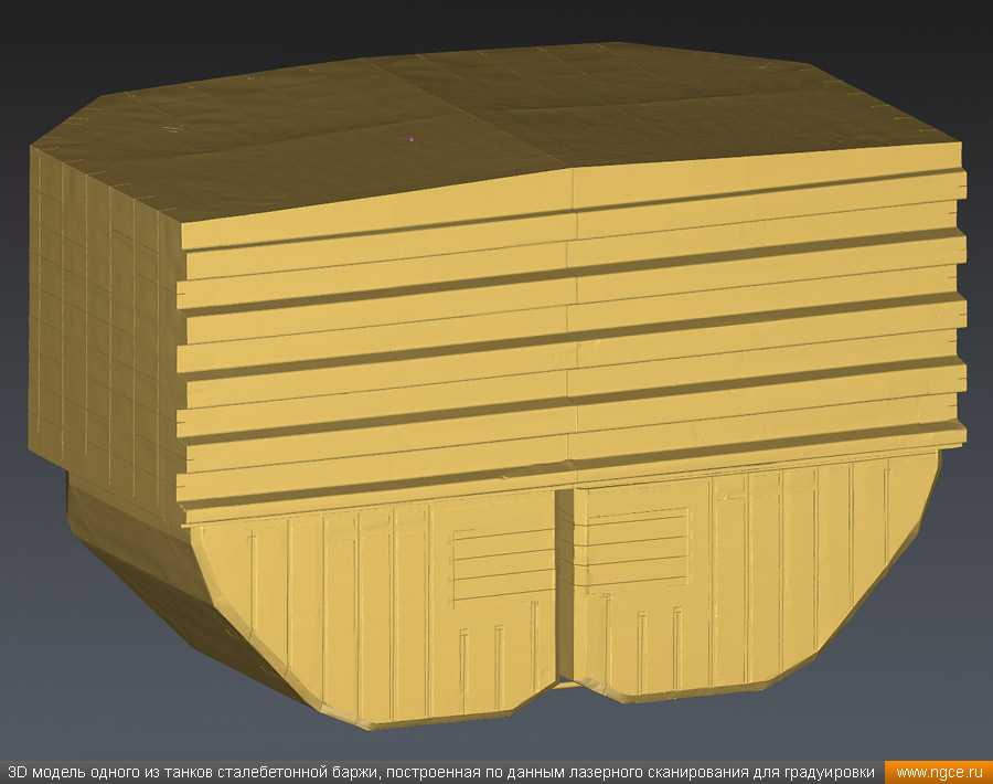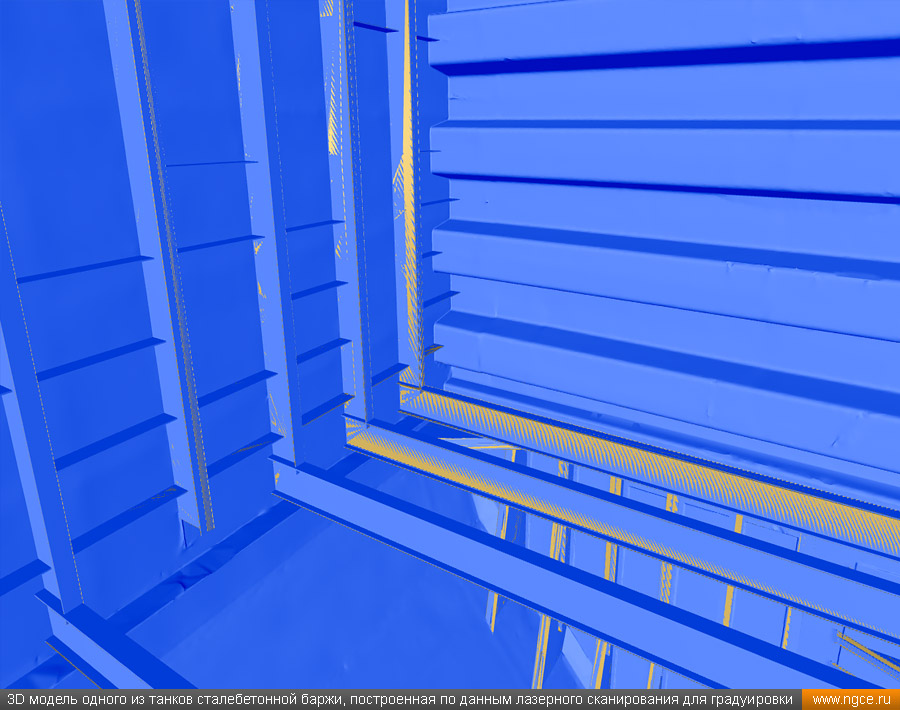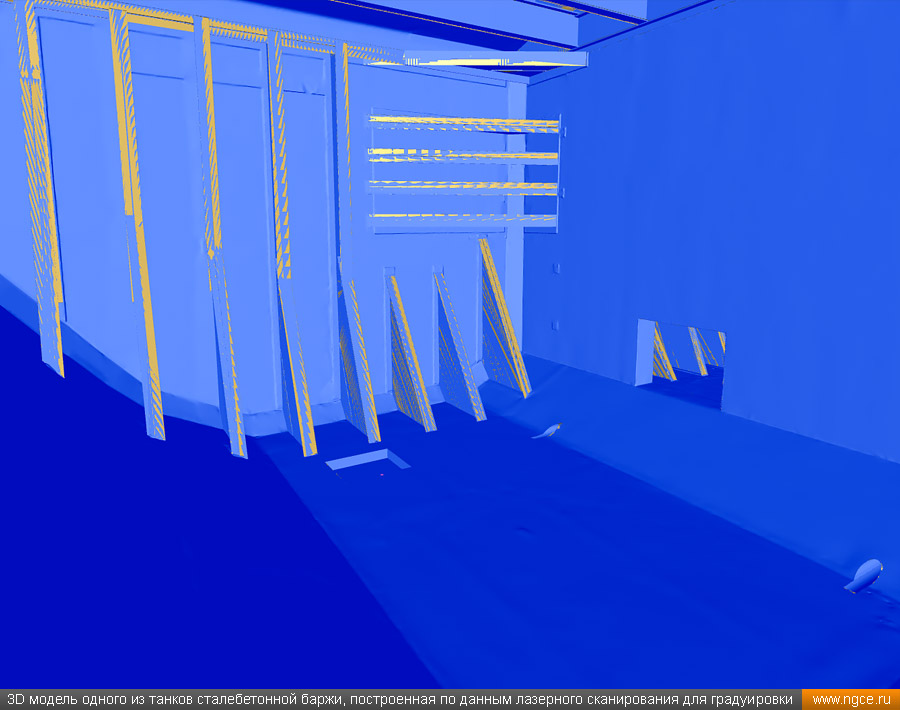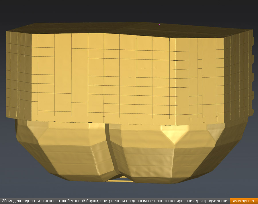 Специалистами инженерного предприятия «НГКИ» в городе Санкт-Петербург была осуществлена градуировка танков уникальной несамоходной наливной баржи «Необетон» проекта 04080. Уникальность данной баржи состоит в том, что она построена из сталебетона. Наливные баржи типа «Необетон» предназначаются для безопасного круглогодичного хранения нефтепродуктов, это судно может хранить до четырёх видов топлива сегрегированно. Нижняя часть корпуса этого судна выполнена из армированного железобетона, а верхняя его часть — из стали. Железобетонное основание обеспечивает возможность посадки судна на грунт во время эксплуатации. Плавучее нефтехранилище оборудовано восемью попарно соединёнными грузовыми танками. Точная калибровка танков геометрическим методом с помощью лазерного сканированияКалибровка резервуаров геометрическим методом с использованием технологии лазерного сканирования является для нашей компании обычной задачей: мы много лет осуществляем градуировку наземных и подземных резервуаров, судовых танков, а также различных типов цистерн и трубопроводов. Подобную работу мы провели в Санкт-Петербурге, оперативно осуществив лазерное сканирование и моделирование танков наливной сталебетонной баржи «Необетон» с составлением в конечном итоге градуировочных таблиц для каждого из восьми её танков. Градуировка больших резервуаров с применением технологии лазерного сканирования — это единственная методика получения градуировочных таблиц, которая за разумные деньги позволяет в сжатые сроки получить реальные объёмы продукта в танках и резервуарах, поскольку устаревший объёмный метод калибровки резервуаров требует гигантского количества воды или другого жидкого продукта, что влечёт за собой огромную стоимость работы, большие временные затраты и итоговую нецелесообразность его применения, не говоря о том, что утилизировать использованную воду вместе с остатками нефтепродуктов крайне проблематично. Также неоспоримым преимуществом геометрического метода градуировки резервуаров с применением 3D обмеров лазерным сканером является возможность проведения полевых работ практически в любую погоду (температурный диапазон от +30°C до -15°C) и в любое время суток. Для выполнения всех необходимых обмерных работ на наливном судне и градуировки резервуаров геометрическим методом необходимо всего два условия: Обмерные работы во всех восьми грузовых танках этой нефтеналивной баржи, которые представляют собой попарно соединённые между собой проёмами бетонные чаши с металлоконструкциями в верхней части, были осуществлены нашими инженерами методом лазерного сканирования с помощью 3D системы Leica RTC360. Трёхмерный лазерный сканер Leica RTC360 — высокоточный прибор, дающий возможность в автоматическом режиме проводить до 2 миллионов измерений в секунду, при этом точность каждого единичного измерения для определения пространственных координат составляет 1 мм. Важной особенностью этого 3D сканера является автоматическое выравнивание точно по горизонту на аппаратном уровне. Сам лазерный сканер может быть наклонён физически, а результаты измерений всё равно получаются точно выравненными по горизонту. Эта функция очень сильно экономит время при перестановке 3D сканера. 3D моделирование и составление градуировочных таблиц танко