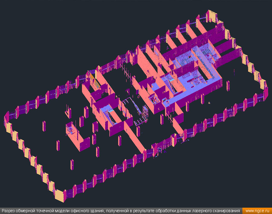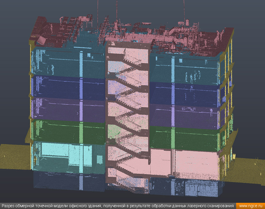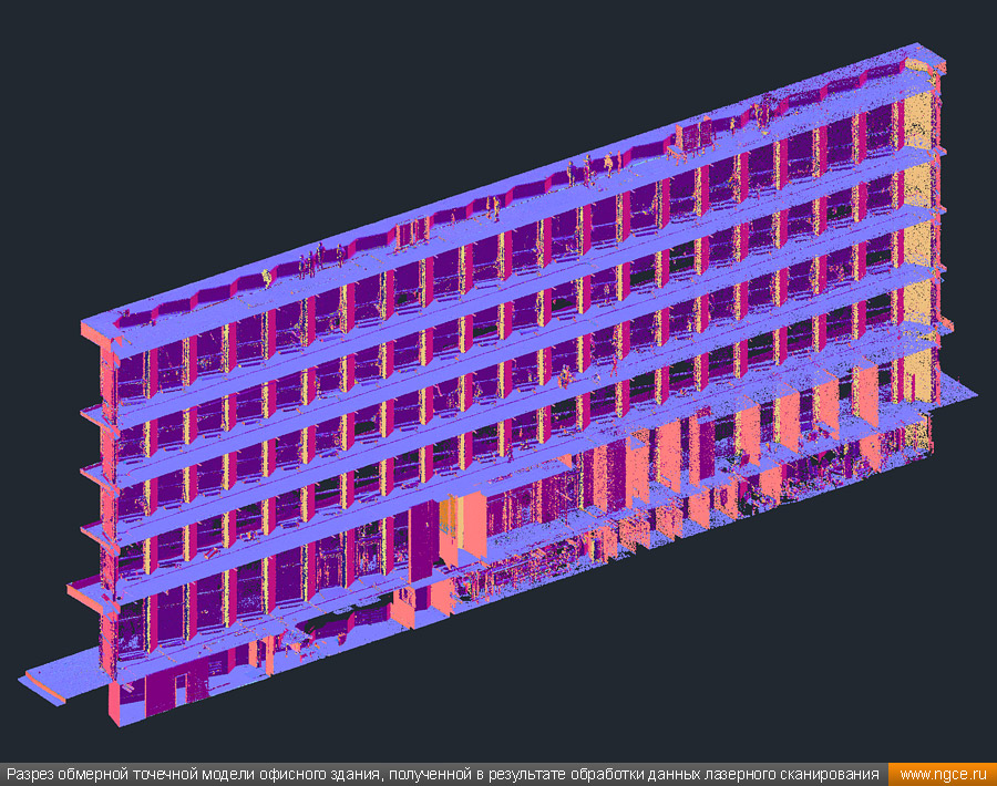 Инженерная компания «НГКИ» выполнила точные 3D обмеры строящегося шестиэтажного офисного здания в ближнем Подмосковье. Обмерные работы были произведены нами методом трёхмерного лазерного сканирования при помощи 3D системы Leica RTC360 по заказу архитектурного бюро для BIM-проектирования планировки офисных помещений и оборудования, а также дизайна интерьеров и внутреннего обустройства. 3D обмеры офисного здания в ближнем Подмосковье для целей BIM-проектированияПредставители архитектурного бюро, которому собственно и была поручена разработка проекта планировки офисных помещений и оборудования, а также дизайна интерьеров и внутреннего обустройства, обратились к нам с просьбой произвести на данном объекте трёхмерное лазерное сканирование и передать им полученную в результате обмерную точечную 3D модель здания для целей BIM проектирования. Обмерные работы были произведены нами методом лазерного сканирования при помощи 3D системы Leica RTC360, которая представляет собой инновационный высокоточный прибор, дающий возможность в автоматическом режиме проводить до 2 миллионов измерений в секунду, при этом точность каждого единичного измерения для определения пространственных координат составляет 1 мм. Важной особенностью этого 3D сканера является автоматическое выравнивание точно по горизонту на аппаратном уровне. Сам лазерный сканер может быть наклонён физически, а результаты измерений всё равно получаются точно выравненными по горизонту. Эта функция очень сильно экономит время при перестановке 3D сканера. В итоге наши специалисты в рамках данного проекта провели лазерное сканирование интерьеров и фасадов готового шестиэтажного здания в состоянии shell&core общей площадью около 12000 квадратных метров. Обмерные работы на данном объекте заняли шесть рабочих дней. Обработка данных лазерного сканирования и подготовка 3D модели зданияНа камеральном этапе работ полученные в результате обмерных работ сканы были очищены от посторонних шумов и лишних объектов, а затем сшиты в единое облако точек лазерного сканирования, представляющее собой точечную 3D модель объекта в стандартном формате RCP (Autodesk ReCaP) с возможностью просмотра 3D панорам с каждой станции лазерного сканирования. Камеральный этап работ, на котором нами была подготовлена необходимая Заказчику обмерная точечная 3D модель офисного здания, был выполнен за семь рабочих дней. Таким образом, на реализацию всего проекта потребовалось менее двух недель. Полученная в результате всех выполненных на полевом и камеральном этапах работ обмерная точечная 3D модель здания была передана Заказчику в привычном всем формате RCP для создания по ней BIM-модели и проектирования офисных помещений, оформления фасадов и размещения инженерных коммуникаций и различного оборудования. Заказчик остался очень доволен отличным качеством и высокой точностью полученных отчётных материалов, а также оперативностью выполнения работ нашими инженерами. Инженерное предприятие «НГКИ» на протяжении многих лет профессионально занимается производством обмерных работ жилых и нежилых помещений для целей подготовки дизайн-проектов оформления внутреннего обустройства. Мы занимаемся обмерами квартир, коттеджей, дачных домов, офисных и торговых помещений, торговых павильонов с точной фиксацией всех коммуникаций. Н