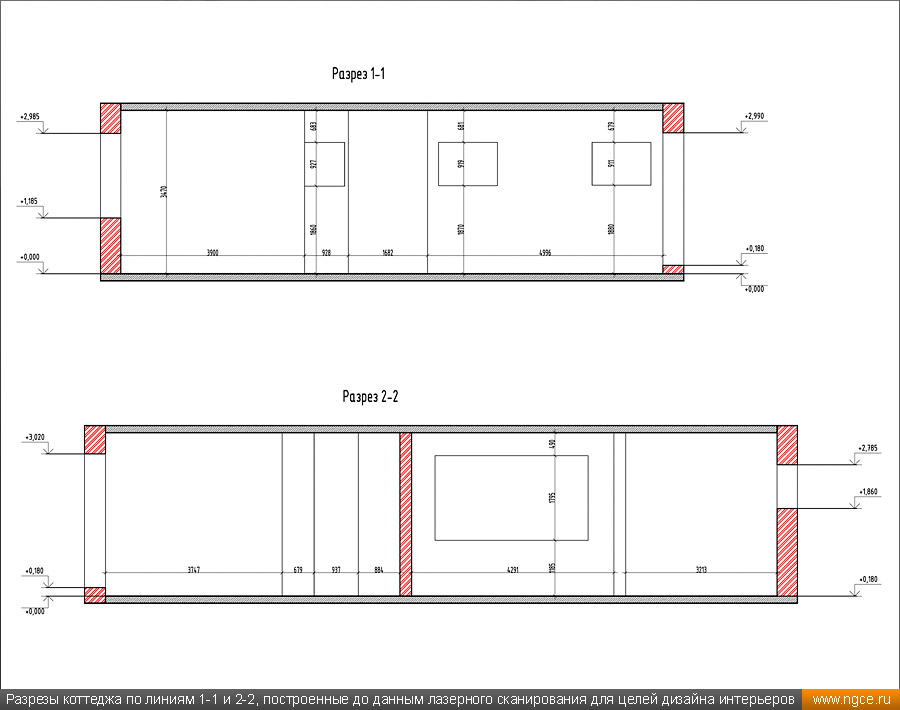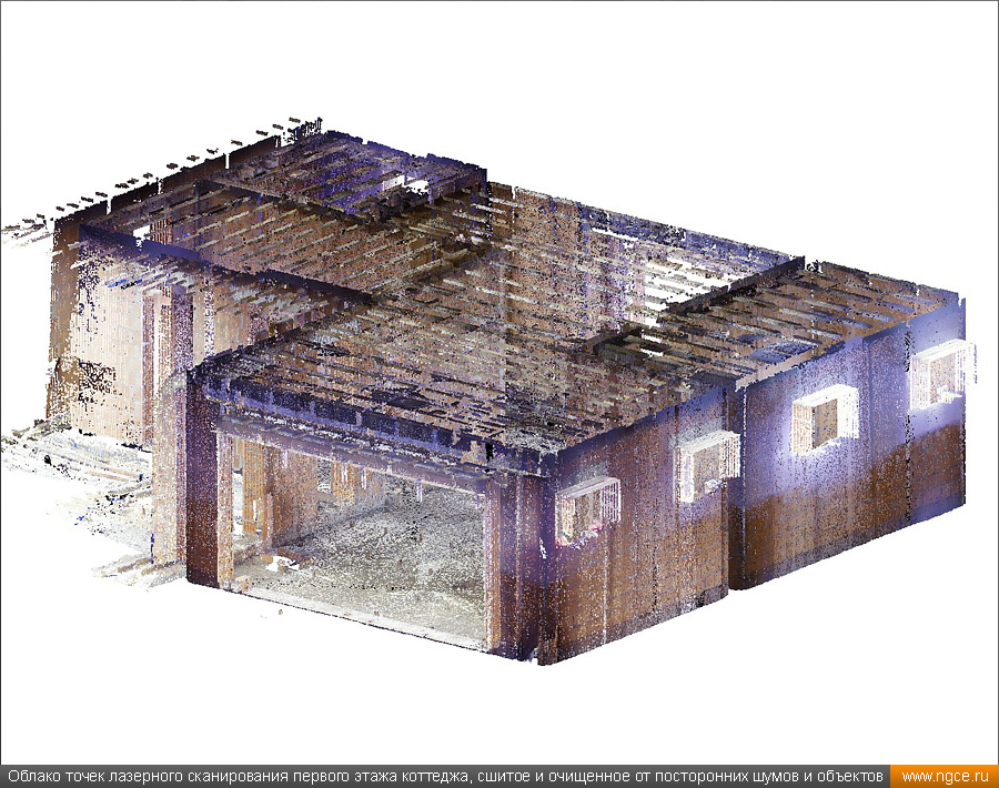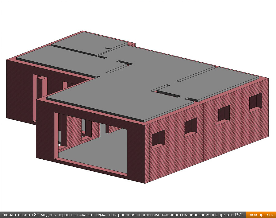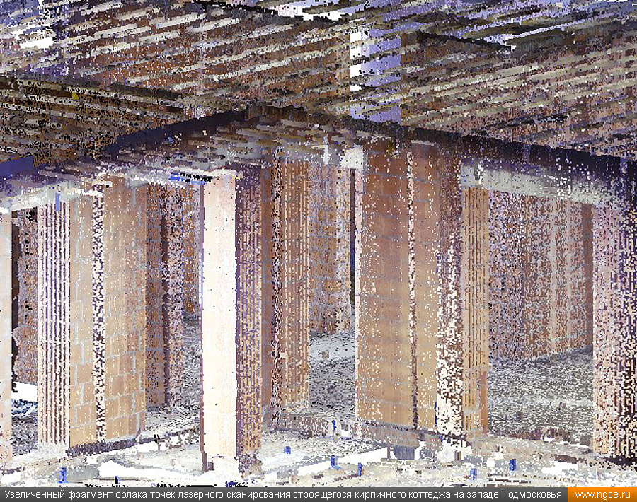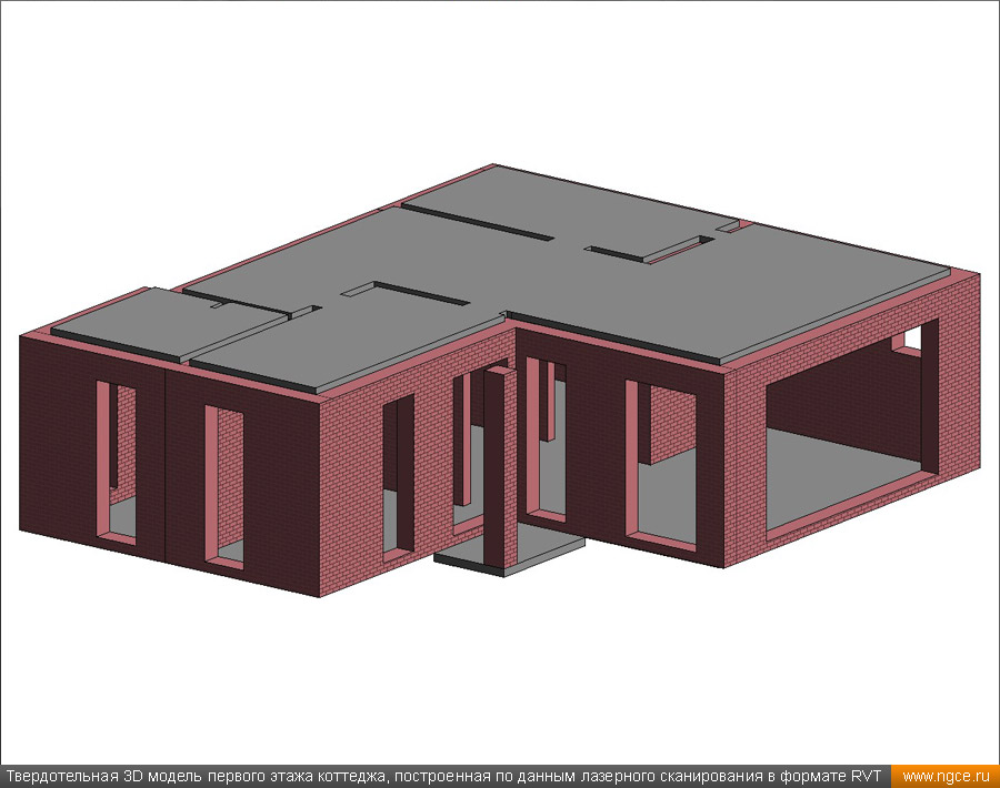 Инженерная компания «НГКИ» выполнила проект по обмерам небольшого строящегося частного коттеджа на западе Московской области и созданию его точной обмерной 3D модели в программной среде Revit (формат RVT) для целей проектирования дизайна интерьеров, а также внешней и внутренней отделки. Обмеры коттеджа методом лазерного сканирования для 3D моделирования в RevitТренд на использование готовых 3D моделей стал определяющим уже несколько лет назад, и в настоящее время всё большее число дизайнеров и архитекторов при разработке своих проектов успешно работает именно с трёхмерными обмерными моделями объектов в формате Revit (RVT). Архитектор, ведущий проект отделки и дизайна интерьеров коттеджа, обратился к нам с просьбой провести лазерное сканирование строящегося коттеджа и затем построить точную обмерную 3D модель данного здания в формате Revit с уровнем детализации LOD 200, а также подготовить несколько обмерных чертежей. Подмосковный коттедж, 3D обмеры которого мы провели, строился из кирпича и на момент осуществления 3D съёмки находился в состоянии Shell & Core без коммуникаций. Точные обмерные работы были произведены специалистами нашей компании методом лазерного сканирования при помощи 3D системы Leica RTC360. Трёхмерный лазерный сканер Leica RTC360 — высокоточный прибор, дающий возможность в автоматическом режиме проводить до 2 миллионов измерений в секунду, при этом точность каждого единичного измерения для определения пространственных координат составляет 1 мм. Важной особенностью этого 3D сканера является автоматическое выравнивание точно по горизонту на аппаратном уровне. Сам лазерный сканер может быть наклонён физически, а результаты измерений всё равно получаются точно выравненными по горизонту. Эта функция очень сильно экономит время при перестановке 3D сканера. Места стоянок лазерного сканера рассчитывались таким образом, чтобы обеспечить максимальное покрытие каждого сканируемого объекта. Также лазерное сканирование осуществлялось с взаимным перекрытием сканов, необходимым и достаточным для последующей сшивки по общим контурам. Ниже вы можете ознакомиться с примерами скриншотов облаков точек 3D лазерного сканирования, полученных нами в результате всех выполненных обмерных работ: Обработка данных лазерного сканирования и 3D моделирование коттеджа для целей подготовки дизайн-проектаЛазерное сканирование всех помещений коттеджа и фасадов заняло всего несколько часов, далее наши специалисты вернулись в московский офис и приступили к выполнению камеральной стадии работ по данному проекту. На камеральном этапе работ сначала была осуществлена сшивка облаков точек лазерного сканирования и их очистка от всех посторонних шумов и лишних объектов. В результате нашими инженерами была получена точечная 3D модель объекта. Далее наши инженеры приступили к созданию твердотельной обмерной 3D модели коттеджа и к подготовке обмерных чертежей, которые также требовались дизайнерам интерьеров. Суммарно камеральная стадия работ по данному проекту продолжалась два дня, и в её результате по обработанным полевым данным нами была построена очень точная и подробная твердотельная обмерная 3D модель строящегося коттеджа в программной среде Revit (формат RVT) с уровнем детализации LOD 200, а также подготовлены обмерные чертежи в AutoCAD (формат DWG). Получив ст