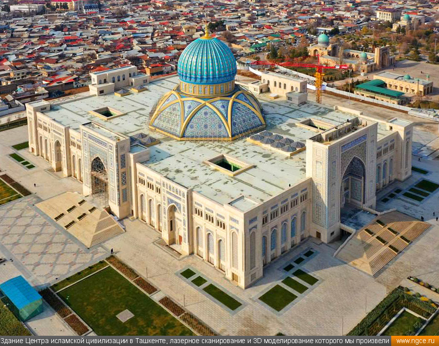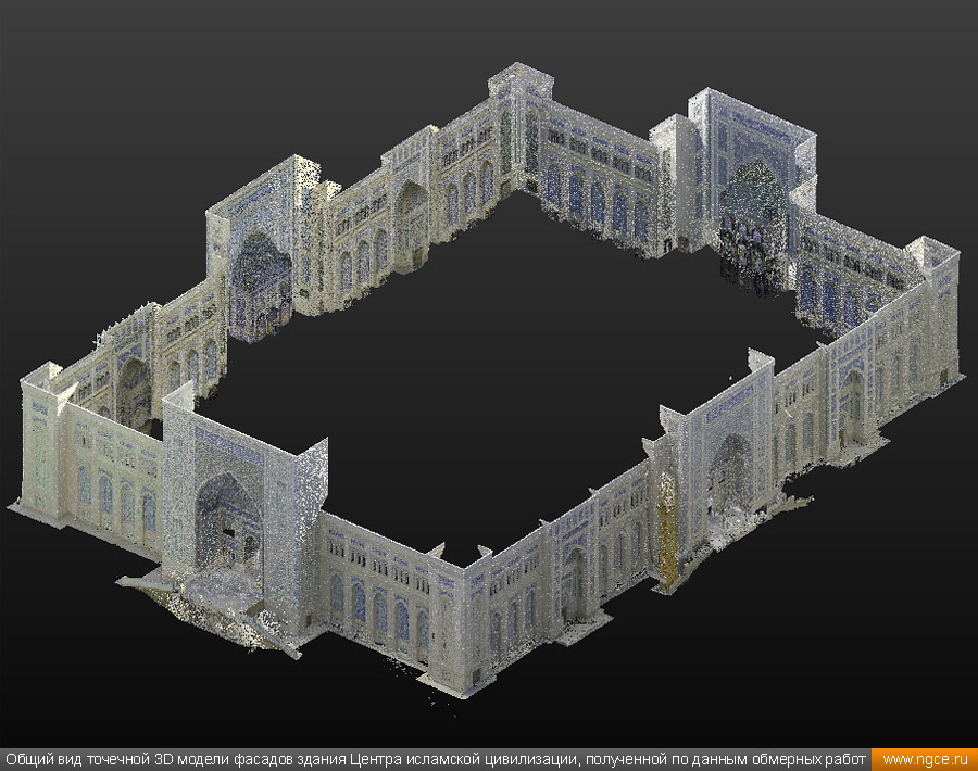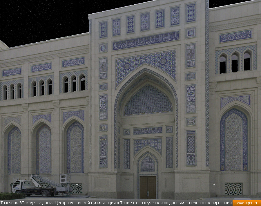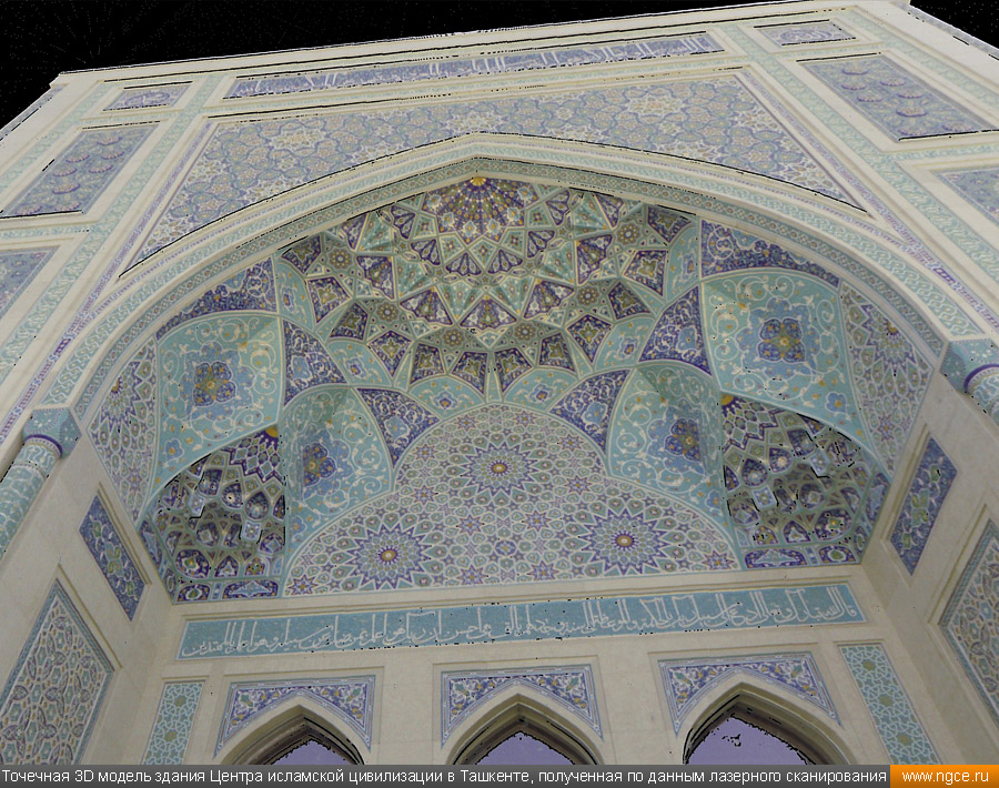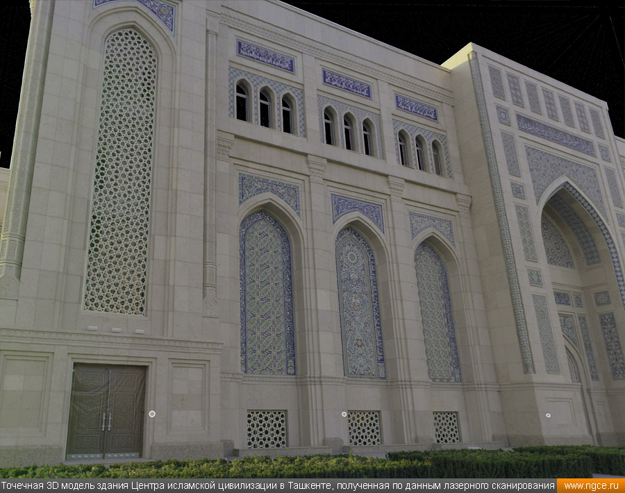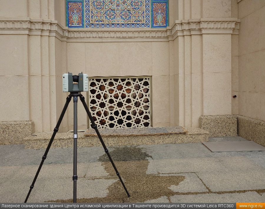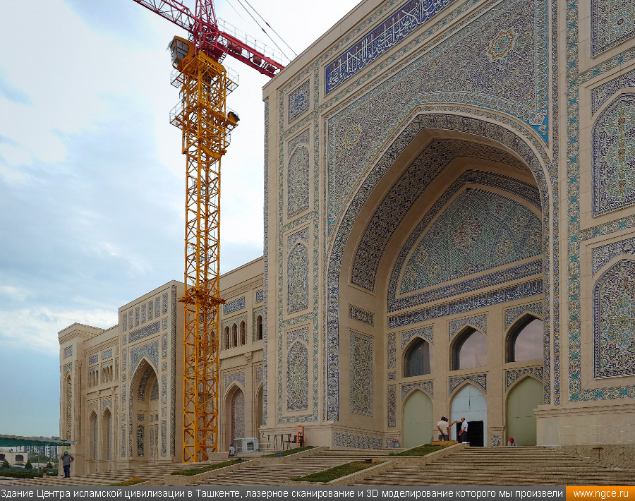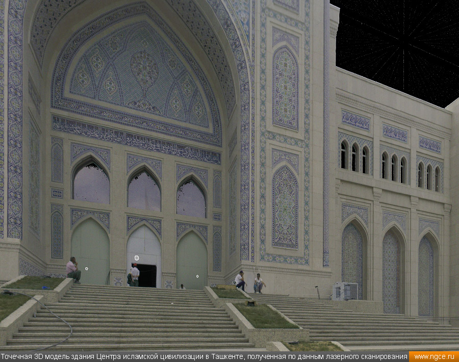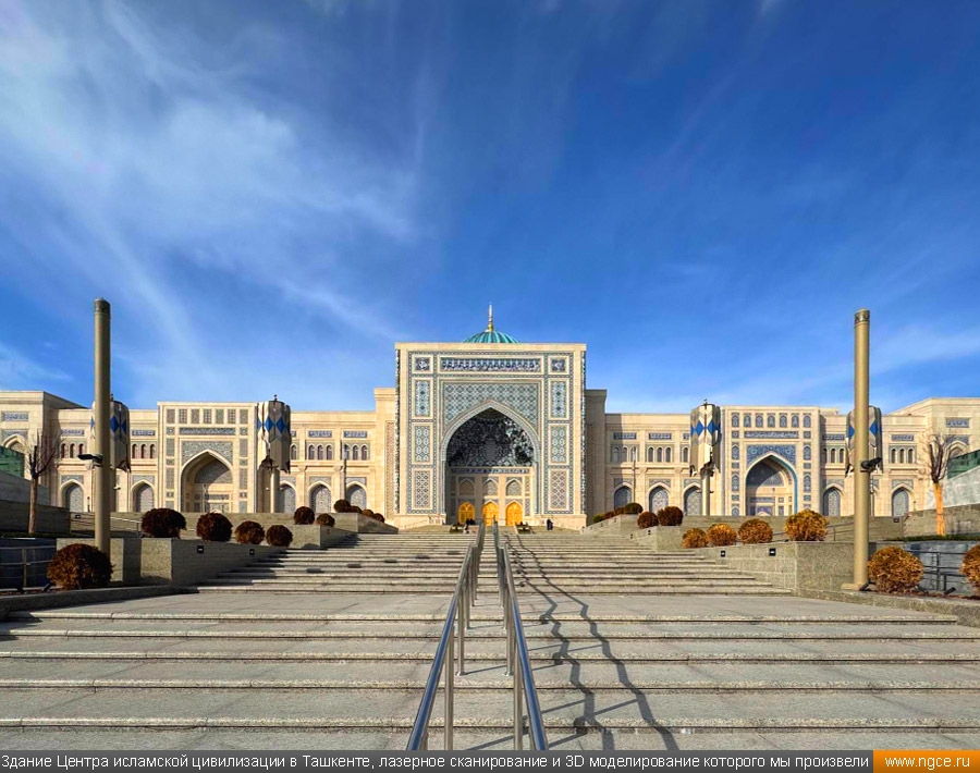 Специалисты инженерной компании «НГКИ» оперативно выполнили интересный проект по 3D обмерам и построению точной трёхмерной цифровой модели здания Центра исламской цивилизации, расположенного в историческом центре города Ташкент в Республике Узбекистан. Обмерные работы на объекте были осуществлены нами методом лазерного сканирования с помощью 3D системы Leica RTC360 для целей 3D мэппинга и художественной подсветки. Технология 3D мэппинга и необходимость лазерного сканирования для неё3D мэппинг или видео-мэппинг — современная технология проведения световых и лазерных представлений, главный принцип которой заключён в проецировании аудиовизуального или статичного изображения на какой-либо физический объект с учётом его геометрии, размеров и расположения. Чтобы в ходе подобных шоу видеоконтент транслировался на неровную поверхность объекта без ненужных искажений или же теней, постановщикам на стадии проектирования представления требуется актуальная и точная 3D модель этого объекта — так называемая «3D маска». Эта 3D маска вводится в компьютер, который затем распределяет весь необходимый контент между транслирующими изображение проекционными установками. Для подготовки 3D маски требуется точная и актуальная трёхмерная модель объекта с учётом его состояния и с чётким отображением различных элементов. Такую модель можно получить в результате проведения обмеров всего объекта методом лазерного сканирования. Коротко о Центре исламской цивилизации в ТашкентеЦентр исламской цивилизации в городе Ташкенте является крупнейшим культурным, научным и просветительским комплексом Узбекистана и одним из наиболее масштабных подобных проектов всего среднеазиатского региона. Центр исламской цивилизации представляет собой объединение музея, исследовательского института, библиотек, научных лабораторий, центров традиционных ремёсел, образовательных подразделений, а также международных партнёрских структур. В Узбекистане считают, что Центр исламской цивилизации должен стать не только хранителем истории, но и крайне важным интеллектуальным пространством, соединяющим прошлое, настоящее и будущее, определяющим ключевые направления развития всей страны. Центр исламской цивилизации называют мостом между Золотым Веком и Новым Узбекистаном. Он призван соединить богатое духовное и научное наследие с современными устремлениями страны, здесь прошлое должно вдохновлять будущее, создавая пространство знаний и прогресса. Деятельность Центра направлена на всестороннее изучение истории Узбекистана с самых древнейших времён вплоть до современного периода с акцентом на заметный вклад региона в развитие мировой цивилизации как в сферах науки и культуры, так и духовного наследия. Особое внимание в Центре уделяется большому научному наследию узбекских учёных, исследованию их трудов, а также современным академическим разработкам и новым открытиям. В разработке научной концепции участвовали сотни узбекских и зарубежных учёных, искусствоведов и религиозных деятелей. За годы подготовки к открытию в Центре собрана большая коллекция, ценность которой трудно выразить в цифрах. Здесь представлены археологические находки возрастом до 80 тысяч лет, редкие рукописи, произведения искусства и священные реликвии, многие из которых можно счит