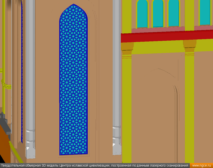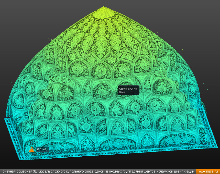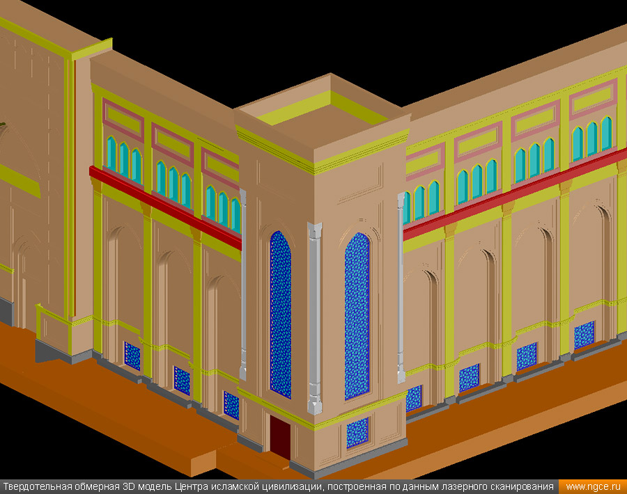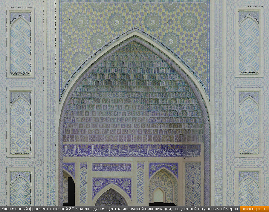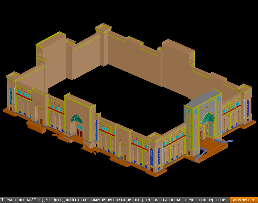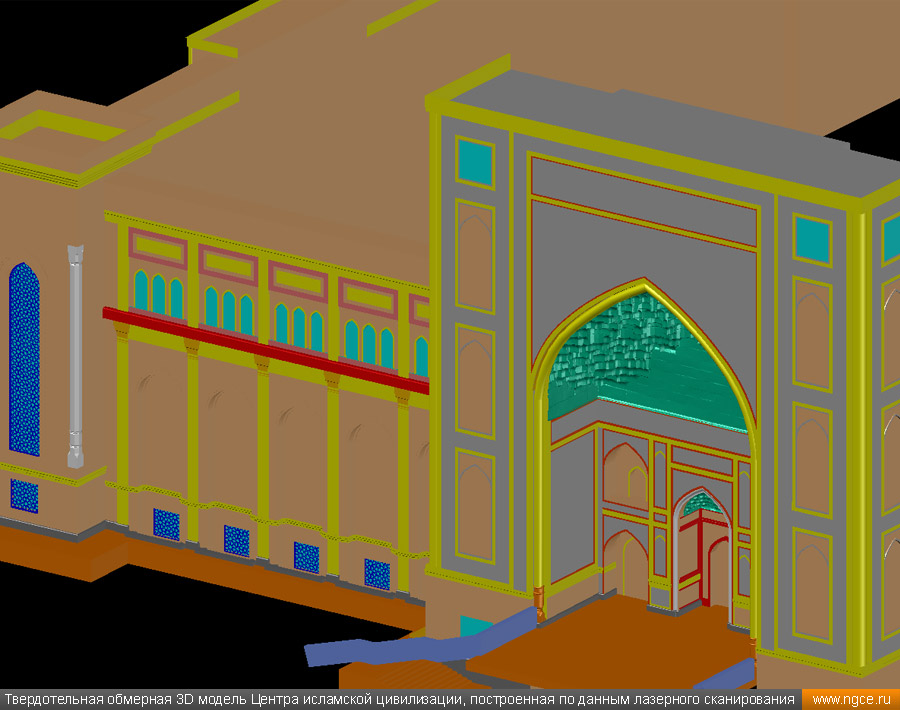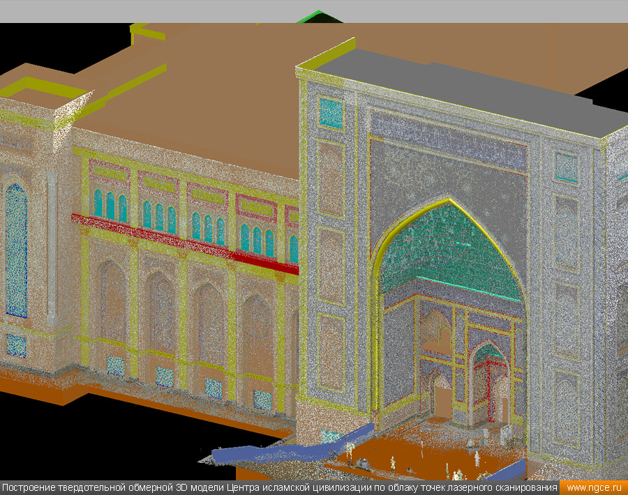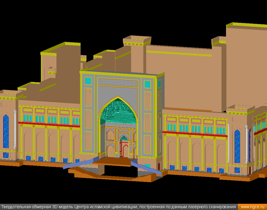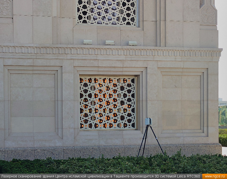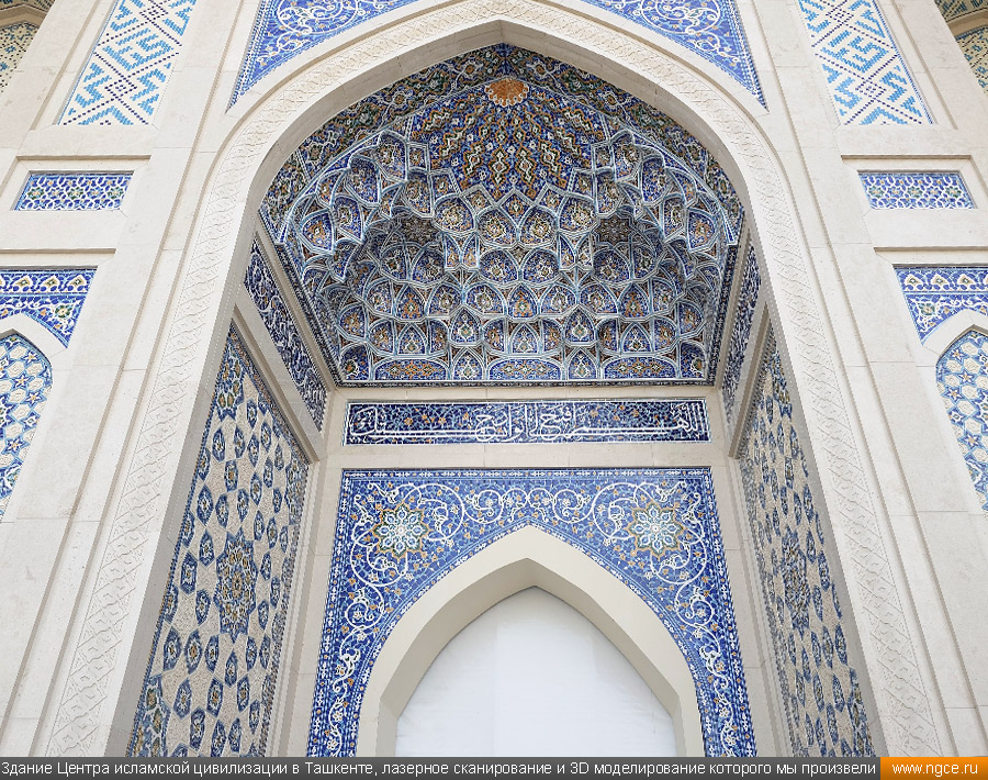 Специалисты инженерной компании «НГКИ» оперативно выполнили интересный проект по 3D обмерам и построению точной трёхмерной цифровой модели здания Центра исламской цивилизации, расположенного в историческом центре города Ташкент в Республике Узбекистан. Обмерные работы на объекте были осуществлены нами методом лазерного сканирования с помощью 3D системы Leica RTC360 для целей 3D мэппинга и художественной подсветки. Технология 3D мэппинга и необходимость лазерного сканирования для неё3D мэппинг или видео-мэппинг — современная технология проведения световых и лазерных представлений, главный принцип которой заключён в проецировании аудиовизуального или статичного изображения на какой-либо физический объект с учётом его геометрии, размеров и расположения. Чтобы в ходе подобных шоу видеоконтент транслировался на неровную поверхность объекта без ненужных искажений или же теней, постановщикам на стадии проектирования представления требуется актуальная и точная 3D модель этого объекта — так называемая «3D маска». Эта 3D маска вводится в компьютер, который затем распределяет весь необходимый контент между транслирующими изображение проекционными установками. Для подготовки 3D маски требуется точная и актуальная трёхмерная модель объекта с учётом его состояния и с чётким отображением различных элементов. Такую модель можно получить в результате проведения обмеров всего объекта методом лазерного сканирования. Коротко о Центре исламской цивилизации в ТашкентеЦентр исламской цивилизации в городе Ташкенте является крупнейшим культурным, научным и просветительским комплексом Узбекистана и одним из наиболее масштабных подобных проектов всего среднеазиатского региона. Центр исламской цивилизации представляет собой объединение музея, исследовательского института, библиотек, научных лабораторий, центров традиционных ремёсел, образовательных подразделений, а также международных партнёрских структур. В Узбекистане считают, что Центр исламской цивилизации должен стать не только хранителем истории, но и крайне важным интеллектуальным пространством, соединяющим прошлое, настоящее и будущее, определяющим ключевые направления развития всей страны. Центр исламской цивилизации называют мостом между Золотым Веком и Новым Узбекистаном. Он призван соединить богатое духовное и научное наследие с современными устремлениями страны, здесь прошлое должно вдохновлять будущее, создавая пространство знаний и прогресса. Деятельность Центра направлена на всестороннее изучение истории Узбекистана с самых древнейших времён вплоть до современного периода с акцентом на заметный вклад региона в развитие мировой цивилизации как в сферах науки и культуры, так и духовного наследия. Особое внимание в Центре уделяется большому научному наследию узбекских учёных, исследованию их трудов, а также современным академическим разработкам и новым открытиям. В разработке научной концепции участвовали сотни узбекских и зарубежных учёных, искусствоведов и религиозных деятелей. За годы подготовки к открытию в Центре собрана большая коллекция, ценность которой трудно выразить в цифрах. Здесь представлены археологические находки возрастом до 80 тысяч лет, редкие рукописи, произведения искусства и священные реликвии, многие из которых можно счит