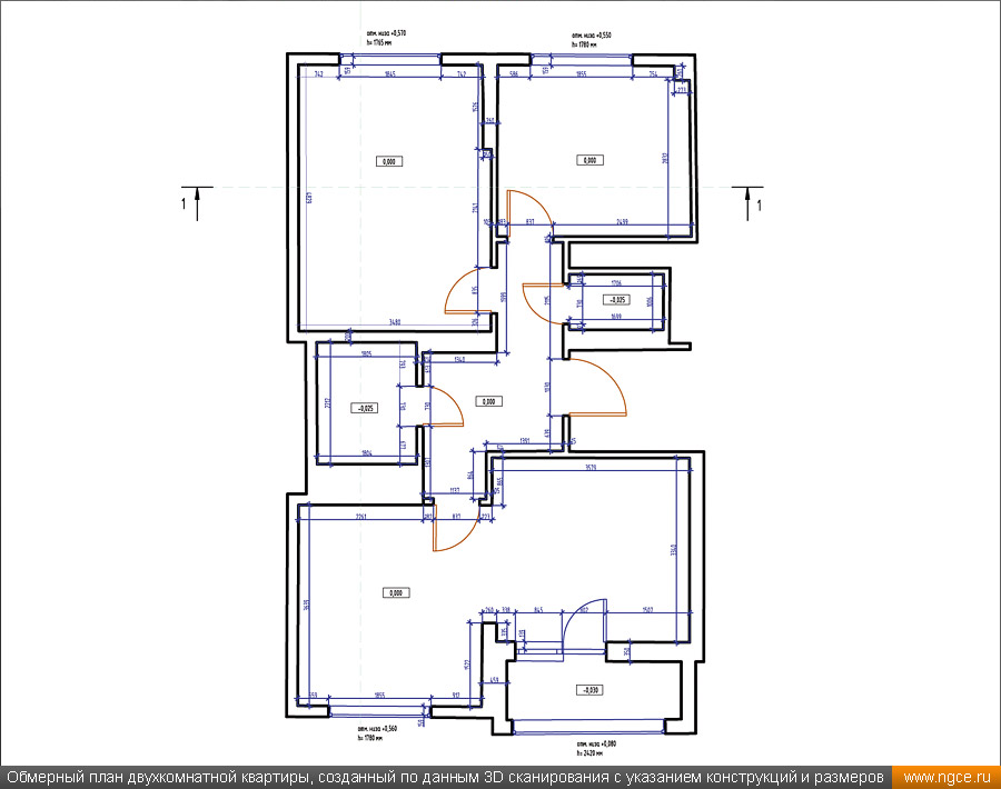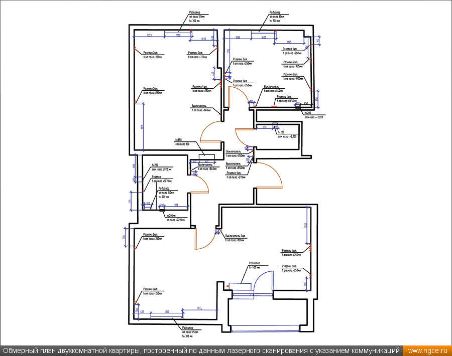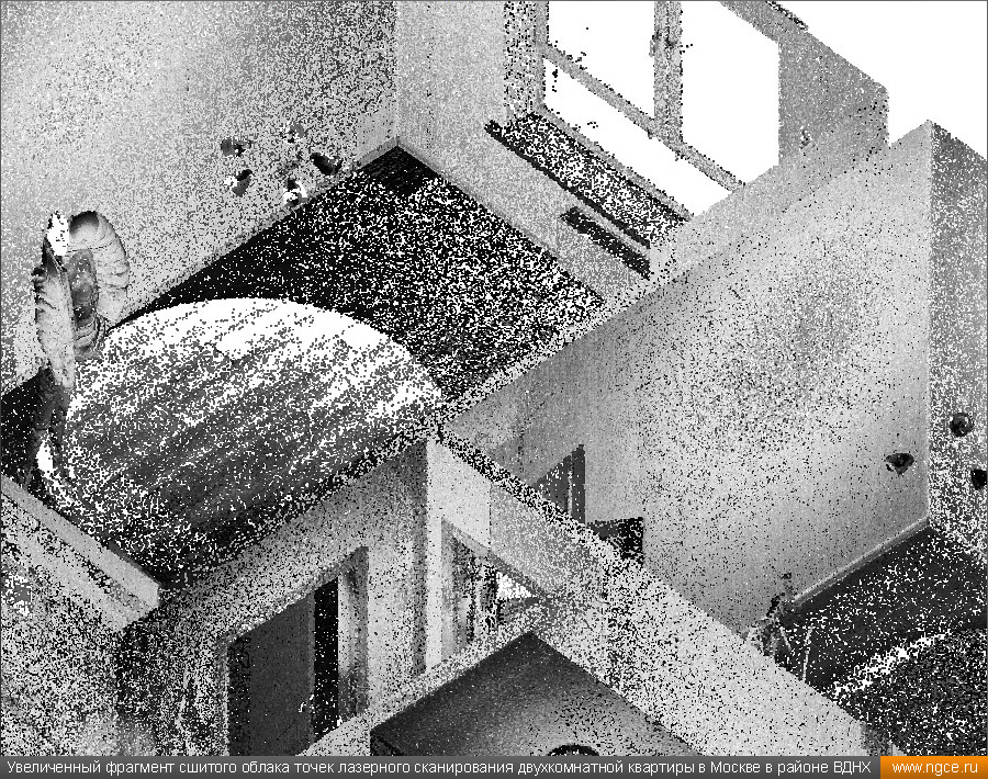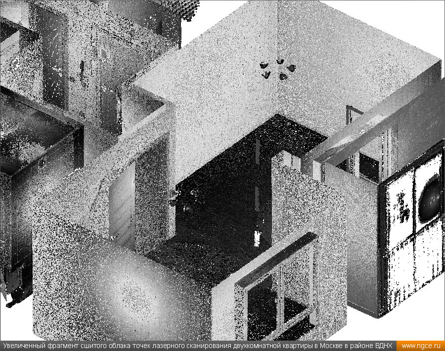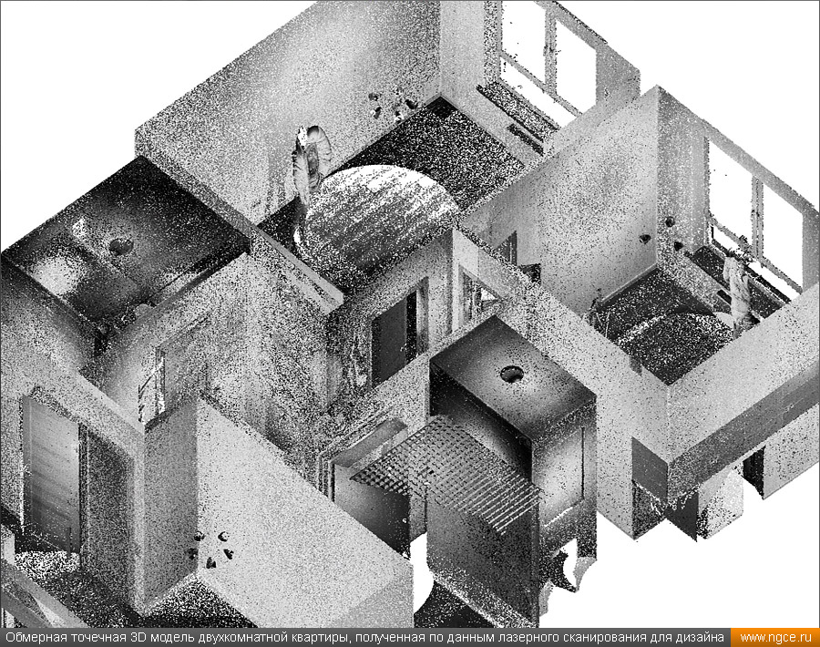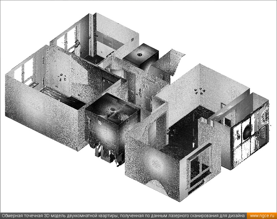 Инженерное предприятие «НГКИ» оперативно выполнило небольшой проект по 3D обмерам и подготовке комплекта обмерных чертежей квартиры в Москве в районе ВДНХ с отображением всех строительных конструкций и инженерных коммуникаций. Заказчиком этих работ выступила одна из московских студий интерьерного дизайна. Дизайнеры обратились в нашу компанию, поскольку мы имеем очень богатый опыт произведения точных 3D обмеров различных помещений и построения их обмерных 3D моделей и обмерных чертежей для целей подготовки проектов дизайна интерьеров. 3D обмеры квартиры методом лазерного сканирования для создания обмерной моделиКвартира московской в новостройке, где мы должны были провести точные 3D обмеры для целей подготовки проекта дизайна интерьеров, была двухкомнатной, общей площадью около 60 квадратных метров с уже выполненным базовым ремонтом, и поэтому на итоговых чертежах нужно было отобразить не только строительные конструкции (как бывает в 90% случаев), но и все уже существующие коммуникации, оконечные элементы электрики и так далее. На момент проведения обмеров квартира была практически пустой, без мебели, техники и прочих бытовых предметов, и это очень заметно сократило время на полевой этап работ и упростило нашу задачу по обработке данных съёмки и построению обмерных чертежей, поскольку для дизайн-проекта очень важны не только высокая точность чертежей квартиры, но и чёткое указание расположения всех инженерных коммуникаций в этом помещении, таких как розетки, освещение, выключатели, радиаторы, кондиционеры, вентиляция — всё это обязательно отображается на итоговых обмерных чертежах. Обмерные работы на данном объекте были осуществлены нашими специалистами методом трёхмерного лазерного сканирования при помощи 3D системы Leica RTC360. Трёхмерный лазерный сканер Leica RTC360 — высокоточный прибор, дающий возможность в автоматическом режиме проводить до 2 миллионов измерений в секунду, при этом точность каждого единичного измерения для определения пространственных координат составляет 1 мм. Важной особенностью этого 3D сканера является автоматическое выравнивание точно по горизонту на аппаратном уровне. Сам лазерный сканер может быть наклонён физически, а результаты измерений всё равно получаются точно выравненными по горизонту. Эта функция очень сильно экономит время при перестановке 3D сканера. Полевой этап работ, на котором было произведено лазерное сканирование квартиры, занял всего два часа, после чего наши специалисты перешли к камеральной стадии работ. Создание обмерных чертежей квартиры со всеми коммуникациями для дизайнеровНа камеральном этапе работ по проекту нашими специалистами была проведена сшивка облаков точек 3D лазерного сканирования, а также их очистка от всех посторонних шумов и лишних объектов. Далее инженеры компании «НГКИ» приступили к подготовке необходимых для дизайнеров интерьера обмерных чертежей квартиры с отображением всех строительных конструкций и всех коммуникаций. На обработку данных лазерного сканирования, сшивку сканов в единое облако точек и подготовку комплекта обмерных чертежей было затрачено суммарно два рабочих день. Заказчику были переданы сшитые и очищенные облака точек лазерного сканирования в давно привычном всем проектировщикам формате RCP, а также обмерные чертежи д
