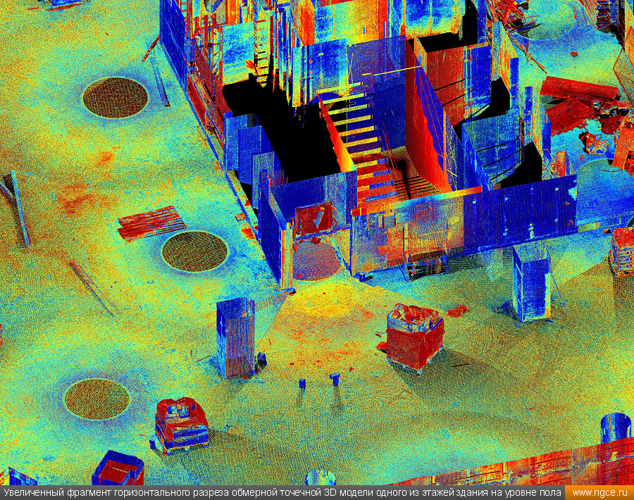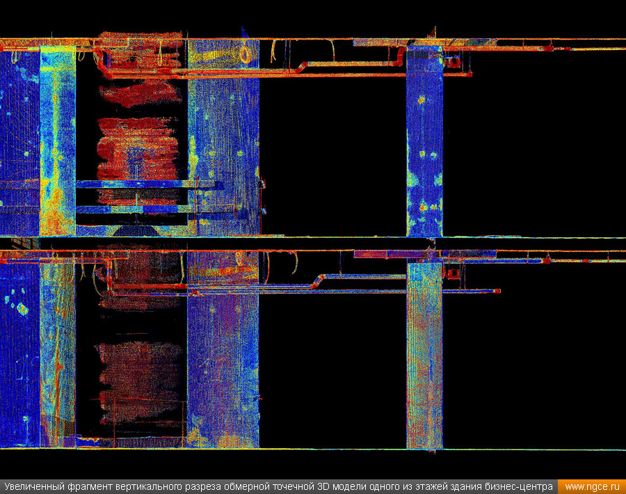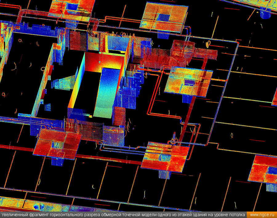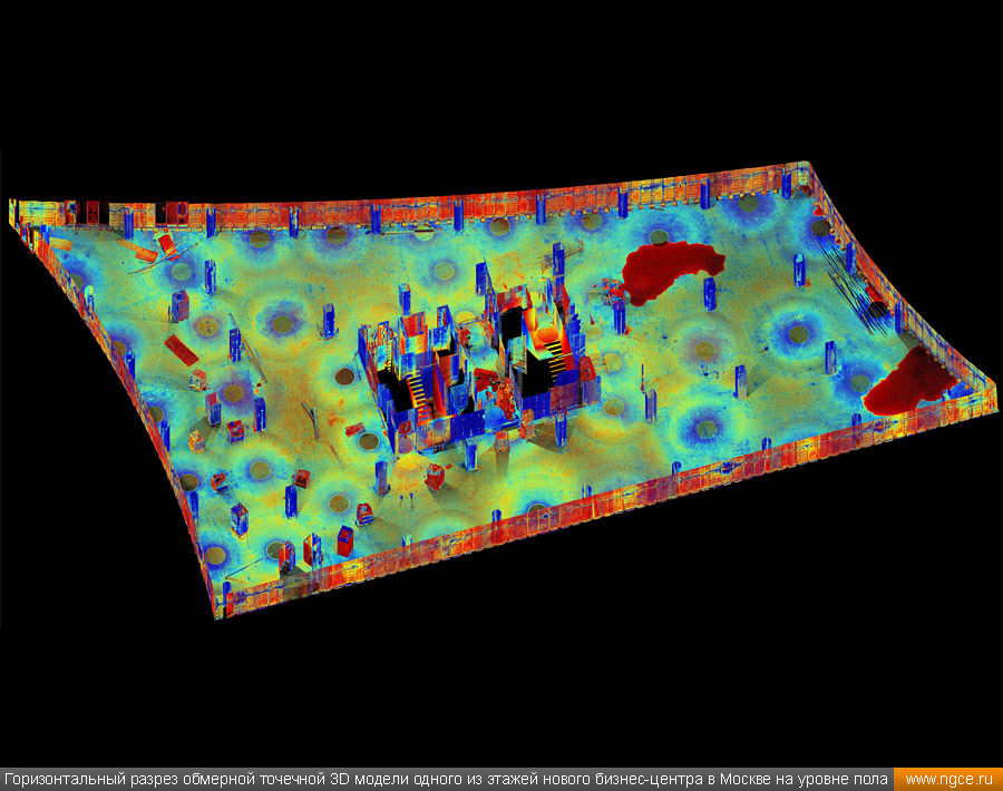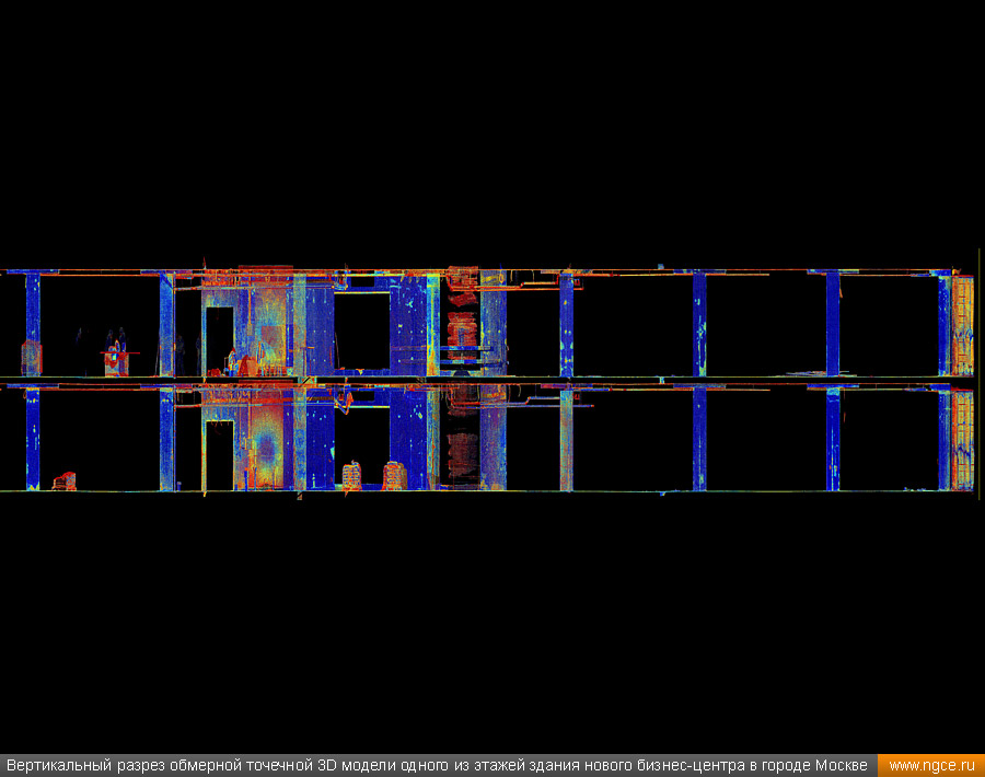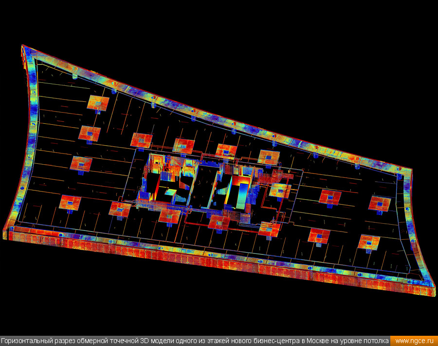 Специалисты инженерного предприятия «НГКИ» выполнили 3D обмеры нового административно-офисного здания в Центральном административном округе города Москвы. Обмерные работы на объекте были осуществлены нами методом лазерного сканирования при помощи 3D системы Leica RTC360 по заказу архитектурного бюро для целей подготовки проекта внутреннего обустройства и дизайна офисных интерьеров. Лазерное сканирование офисных помещений нового бизнес-центра в МосквеПредставители московского архитектурного бюро, которому была поручена разработка крупного проекта внутреннего обустройства и дизайна интерьеров офисных помещений в здании недавно построенного бизнес-центра, обратились к нам с просьбой произвести на данном объекте трёхмерное лазерное сканирование, а затем подготовить обмерные точечные 3D модели для дальнейшего построения по ним BIM-модели этого офисного здания и BIM-проектирования интерьеров. Обмерные работы были произведены нами методом лазерного сканирования при помощи 3D системы Leica RTC360, которая представляет собой компактный, лёгкий, но очень высокопроизводительный 3D лазерный сканер. Трёхмерный лазерный сканер Leica RTC360 — высокоточный прибор, дающий возможность в автоматическом режиме проводить до 2 миллионов измерений в секунду, при этом точность каждого единичного измерения для определения пространственных координат составляет 1 мм. Важной особенностью этого 3D сканера является автоматическое выравнивание точно по горизонту на аппаратном уровне. Сам лазерный сканер может быть наклонён физически, а результаты измерений всё равно получаются точно выравненными по горизонту. Эта функция очень сильно экономит время при перестановке 3D сканера. Общая площадь подлежащих обмерам офисных помещений составила 17000 квадратных метров. Полевой этап работ, на котором было проведено лазерное сканирование всех необходимых помещений, занял пять рабочих дней. Обработка данных лазерного сканирования и подготовка обмерных 3D моделейНа камеральном этапе работ, на который нашими специалистами было затрачено ещё шесть дней, все полученные в результате обмеров сканы были тщательно очищены от всех посторонних шумов и лишних объектов, а затем сшиты в единое облако точек лазерного сканирования, представляющее собой точечную 3D модель объекта в стандартном формате RCP (Autodesk ReCaP) с возможностью просмотра 3D панорам с каждой станции лазерного сканирования. Заказчику были переданы сшитые и очищенные цифровые точечные 3D модели помещений бизнес-центра, которые сразу же поступили в работу к специалистам Заказчика для создания BIM-моделей и проектирования дизайна офисных интерьеров. Заказчик остался очень доволен отличным качеством и высокой точностью полученных отчётных материалов, а также оперативностью выполнения работ нашими инженерами. Инженерное предприятие «НГКИ» на протяжении многих лет профессионально занимается производством обмерных работ жилых и нежилых помещений для целей подготовки дизайн-проектов оформления внутреннего обустройства. Мы занимаемся обмерами квартир, коттеджей, дачных домов, офисных и торговых помещений, торговых павильонов с точной фиксацией всех коммуникаций. Наши специалисты при проведении обмерных работ применяют технологию лазерного сканирования, которая позволяет быстро получить подробные и точ