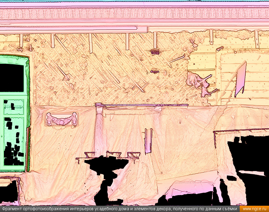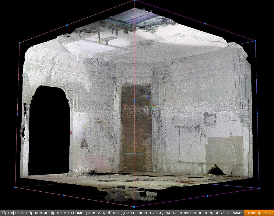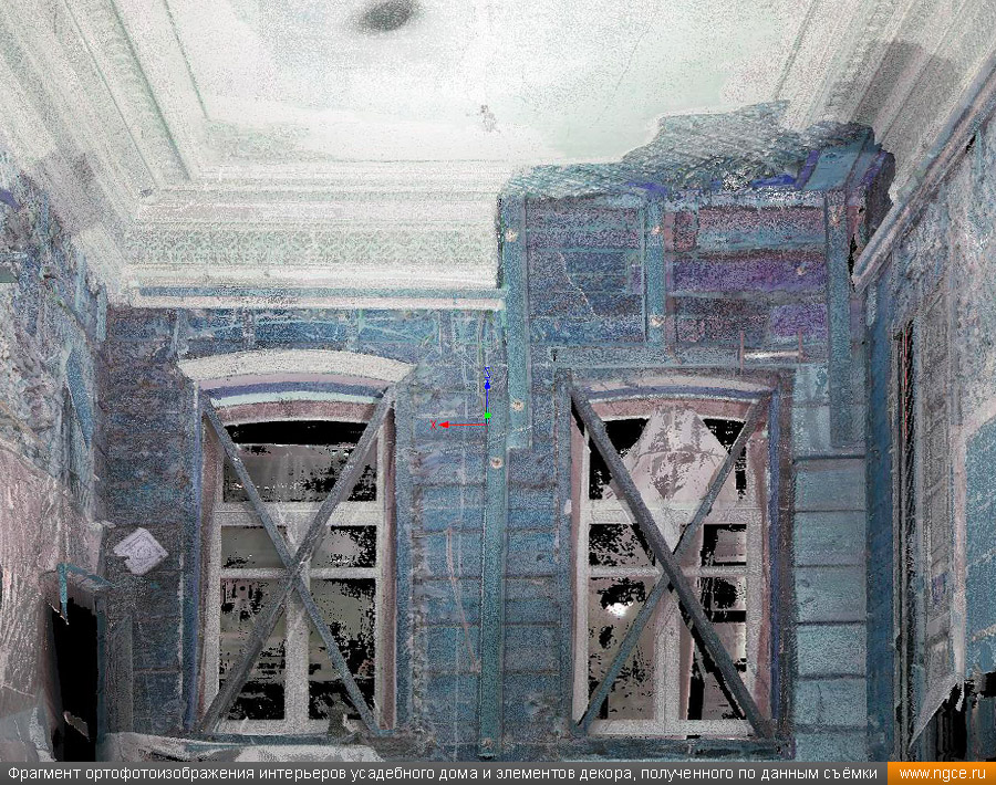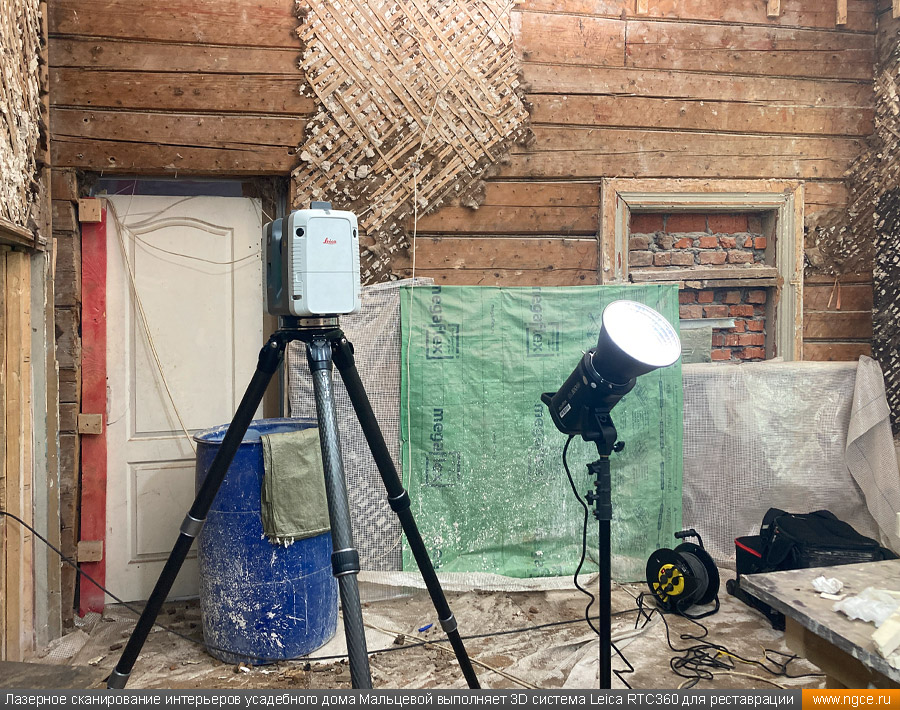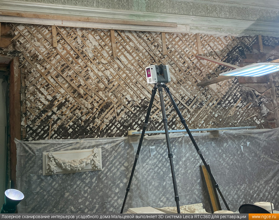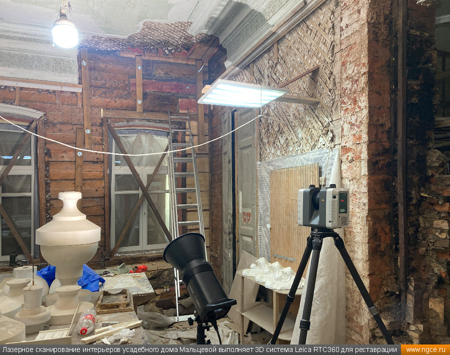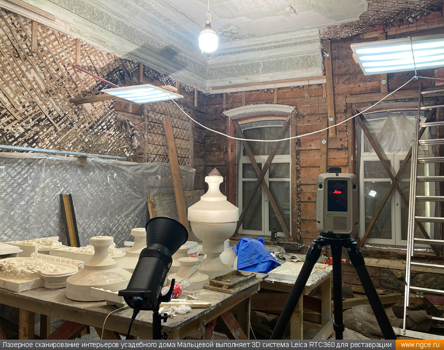 Специалисты инженерной компании «НГКИ» выполнили интересный проект по 3D обмерам интерьеров усадебного дома Мальцевой на Большой Ордынке в Москве для целей подготовки проекта его реставрации. Точные обмерные работы на данном объекте были произведены методом лазерного сканирования с помощью сканирующей системы Leica RTC360 с высокой плотностью съёмки и с использованием встроенной фотокамеры. Городская усадьба Н.Н. Мальцевой является памятником архитектуры регионального значения, усадебный дом был построен в начале XIX века и затем ещё дважды перестраивался, приобретя существующий в наше время вид в начале XX века. Для подготовки проекта реставрации интерьеров этого дома, который на момент нашего визита находился в плачевном состоянии, необходимо было произвести подробное лазерное сканирование, особое внимание обращая на многочисленные элементы лепного декора. Краткая историческая справка об усадебном доме Мальцевой на Большой ОрдынкеПервое здание на месте усадебного дома появилось здесь ещё в конце XVIII века, но история не сохранила ни имени владельцев, ни описания самого дома, скорее всего, погибшего в знаменитом пожаре 1812 года. В 1820 году на этом месте был построен дом для купеческой жены Н.Н. Мальцевой. В 1879–1884 годах усадебный дом реконструировался и даже был частично перестроен по проекту архитектора Н.С. Зубатова. Ещё одна реконструкция и реставрация усадебного дома проводились в самом начале XX века, когда им владел купец М.С. Романов, известный владелец доходного дома «Романовки» на углу Тверского бульвара и Малой Бронной улицы. Именно тогда данный дом и приобрёл существующий в наше время вид. Последним же дореволюционным владельцем усадьбы в 1910 году стал купец В.В. Петров. Фасад дома Мальцевой обильно украшен лепниной, что делает его почти ажурным, боковые части фасада украшены рустованными лопатками. Дом имеет восемь окон, выходящих на улицу — чётное число, что нехарактерно для эпохи классицизма. Центр фасада подчёркивается двумя окнами с лучковыми фронтонами, справа и слева от них по одному окну с треугольными фронтонами. Две пары боковых окон фасада имеют сандрики с полукруглыми нишами, в которых находятся львиные маски, держащие в пасти гирлянды. Иными словами, на одном фасаде этого дома помещено сразу несколько вариантов оконного декора, и по нему можно изучать все типы фронтонов окон, какими часто украшали дома в Москве в XIX веке и в начале XX века. Пилястры завершаются ионическими капителями с гирляндами, однако вместо средней пилястры в самом центре фасада здания прямо под карнизом находится маленькая маска льва, которая была призвана охранять покой жителей дома. Венчающий карниз украшен волютами и многочисленными гирляндами. За весь XX век и начало XXI века этот усадебный дом неуклонно ветшал и разрушался, пока наконец не было принято решение о проведении реставрационных работ. В 2016–2018 годах была проведена частичная реставрация внешнего вида главного дома. Специалисты воссоздали фальцевую кровлю, печные трубы, слуховые окна, дымники, укрепили стены деревянного сруба, а также кирпичный фундамент здания. И вот спустя несколько лет наконец-то дошло дело и до реставрации интерьеров усадебного дома. 3D обмеры интерьеров усадебного дома для целей реставрацииДля начала подготовки проекта реставрации интерьеро