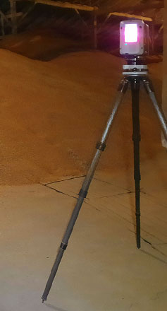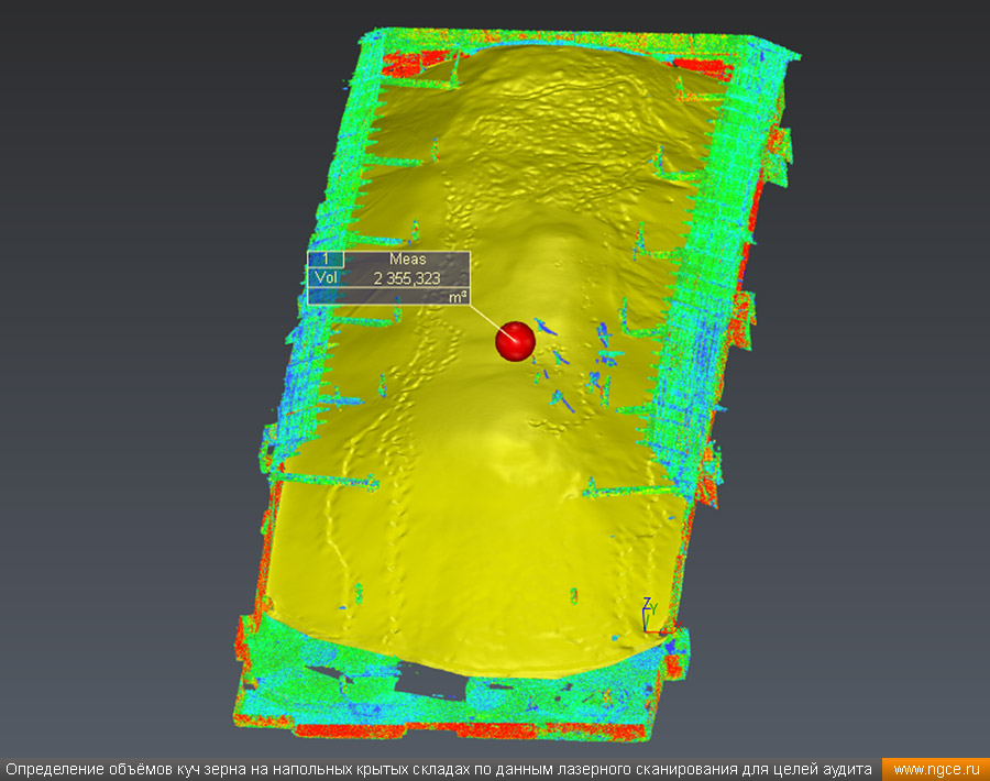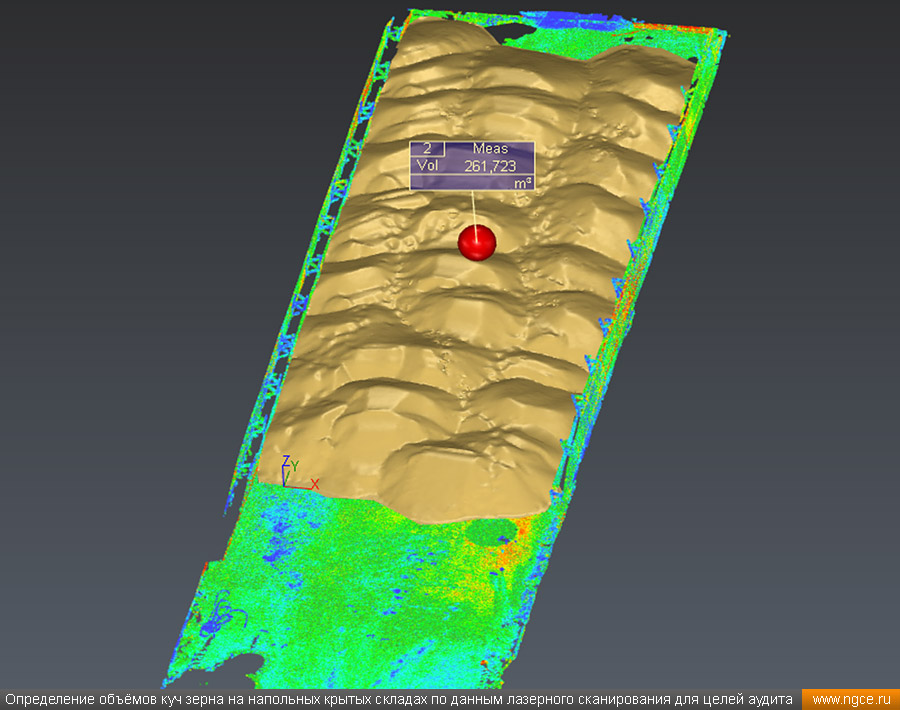 Инженерное предприятие «НГКИ» выполнило проект по точному определению объёмов зерна, хранящегося на крытых напольных складах в Саратовской области. Обмерные работы были осуществлены нашими специалистами методом лазерного сканирования 3D системой Leica RTC360 для целей аудита и учёта количества остатков зерна на хранении. Заказчиком всего данного комплекса работ выступил крупный агрохолдинг, проводящий инвентаризацию и внутренний аудит своих складских запасов зерна. Лазерное сканирование куч зерна на напольных складах для определения объёмовАудиторы крупных сельскохозяйственных холдингов проводят аудит объёма хранящегося урожая после окончания его закладки в конце года и перед новым урожаем в середине лета. Зерно хранится в силосах, напольных крытых складах или в «рукавах» (silobags) непосредственно в поле. В данном случае нашим инженерам было необходимо определить объёмы зерна на хранении в двух удалённых друг от друга локациях на напольных складах. Лазерное сканирование на нескольких площадках хранения зерна в двух разных населённых пунктах было произведено нашими специалистами за два рабочих дня при помощи универсальной 3D системы Leica RTC360. В одной локации инженерами нашей компании было обмерено одиннадцать крытых напольных складов, а во второй — шесть. Трёхмерный лазерный сканер Leica RTC360 — высокоточный прибор, дающий возможность в автоматическом режиме проводить до 2 миллионов измерений в секунду, при этом точность каждого единичного измерения для определения пространственных координат составляет 1 мм. Важной особенностью этого 3D сканера является автоматическое выравнивание точно по горизонту на аппаратном уровне. Сам лазерный сканер может быть наклонён физически, а результаты измерений всё равно получаются точно выравненными по горизонту. Эта функция очень сильно экономит время при перестановке 3D сканера. Места стоянок лазерного сканера рассчитывались таким образом, чтобы обеспечить максимальное покрытие каждого сканируемого объекта. Также лазерное сканирование осуществлялось с взаимным перекрытием сканов, необходимым и достаточным для последующей сшивки по общим контурам. Измерение объёмов хранения зерна на крытых напольных складахПо результатам лазерного сканирования нашими специалистами на камеральном этапе работ сначала были созданы точные обмерные цифровые 3D модели объектов, а затем выполнен подсчёт объёма зерна в каждом бурте на каждом складе хранения. Определение объёмов зерна в буртах на напольных крытых складах является самой стандартной и не очень сложной задачей, поскольку кучи зерна на таких обычных складах сложены навалом. В данном случае производится лазерное сканирование и 3D моделирование буртов зерна, затем строится отсчётная плоскость. При производстве обмеров насыпей (буртов) сельскохозяйственной продукции отсчётная плоскость (это подстилающая поверхность, на которой находится насыпь), всегда скрыта от средств измерений, поэтому отсутствует возможность построения её точной трёхмерной модели по результатам измерений. Также, как правило, отсутствует и возможность проведения обмеров и построения точных моделей поверхностей, ограничивающих насыпи с разных сторон. Так как для подсчёта объёма насыпи необходима замкнутая со всех сторон 3D модель насыпи, то для недоступных дл